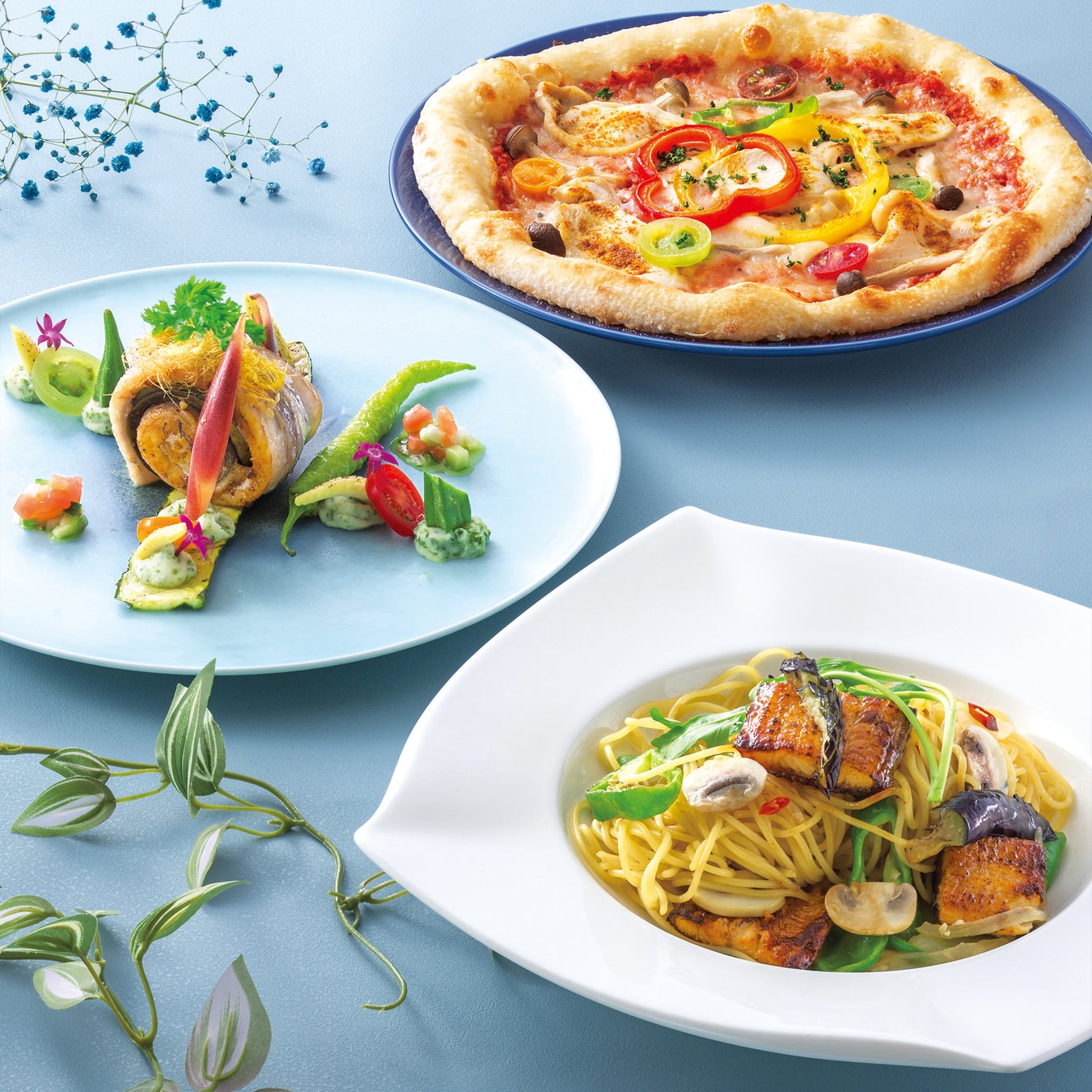 夏のカラダにパワーチャージするランチ3種。ナスを兵庫県産太刀魚で巻いた品は、酸味あるラビコットソースでさっぱりと。播州赤鶏タンドリーチキンのピッツアや鰻と六甲シャンピニオンのペペロンチーノは、スパイシーで夏の食欲を刺激。いずれも新鮮な夏野菜たっぷりで、心が上向きになること間違いなし。