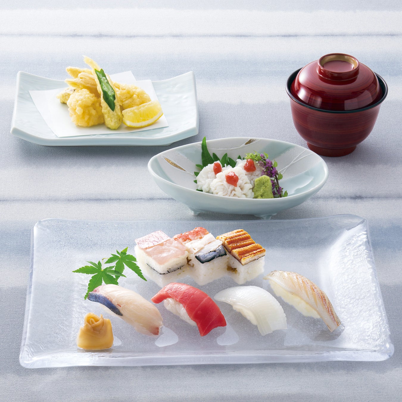 「すし萬」の真髄、伝統の筥(はこ)すしが味わえるランチ。寿司は、小鯛・海老と白身・穴子の3 種の筥すしのほか、旬魚の握りが4 種ラインナップ。「栄養豊富な梅雨の水を飲んで旨くなる」と言われる兵庫県産の鱧は、湯引きと天ぷらで味わえます。兵庫が誇る夏食材と「すし萬」の真価をご堪能ください。