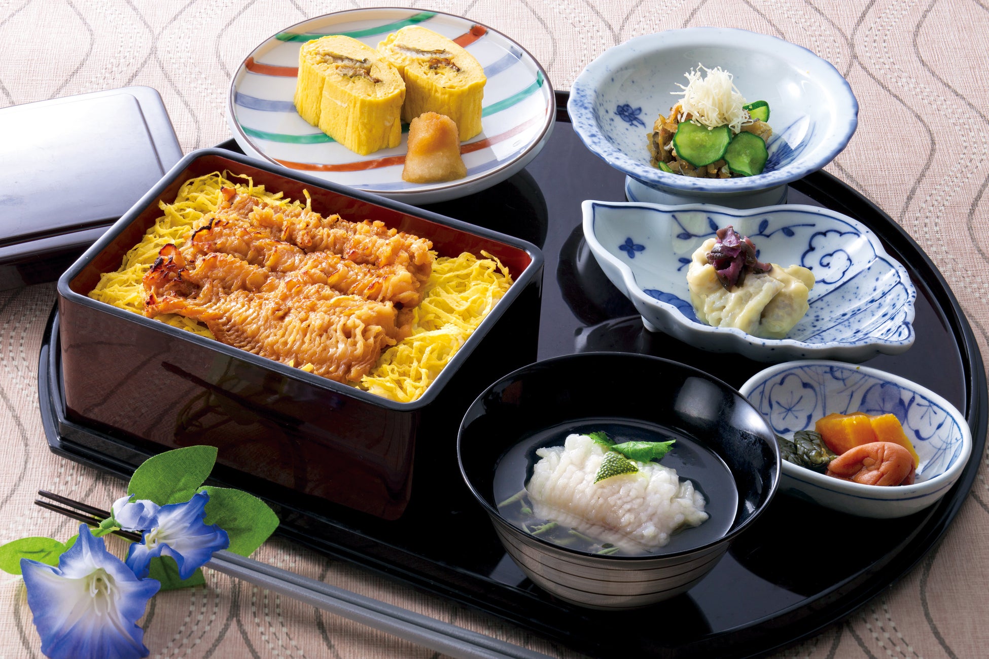 今夏、「神戸たむら」がお届けするのは、淡路島産の“ 新物”の鱧を使った鱧尽くしランチ。脂ののった新鮮な鱧を香ばしく焼き上げ、錦糸玉子とご飯の上に重ねた蒲焼重は、鱧骨でとっただし入りの自家製ダレを絡めると、濃厚な旨みが拡がる逸品。そのほか、鱧柴漬け味噌タルタルや鱧巻き玉子などアレンジ豊かな品が揃った昼膳で、夏を元気に過ごしましょう。