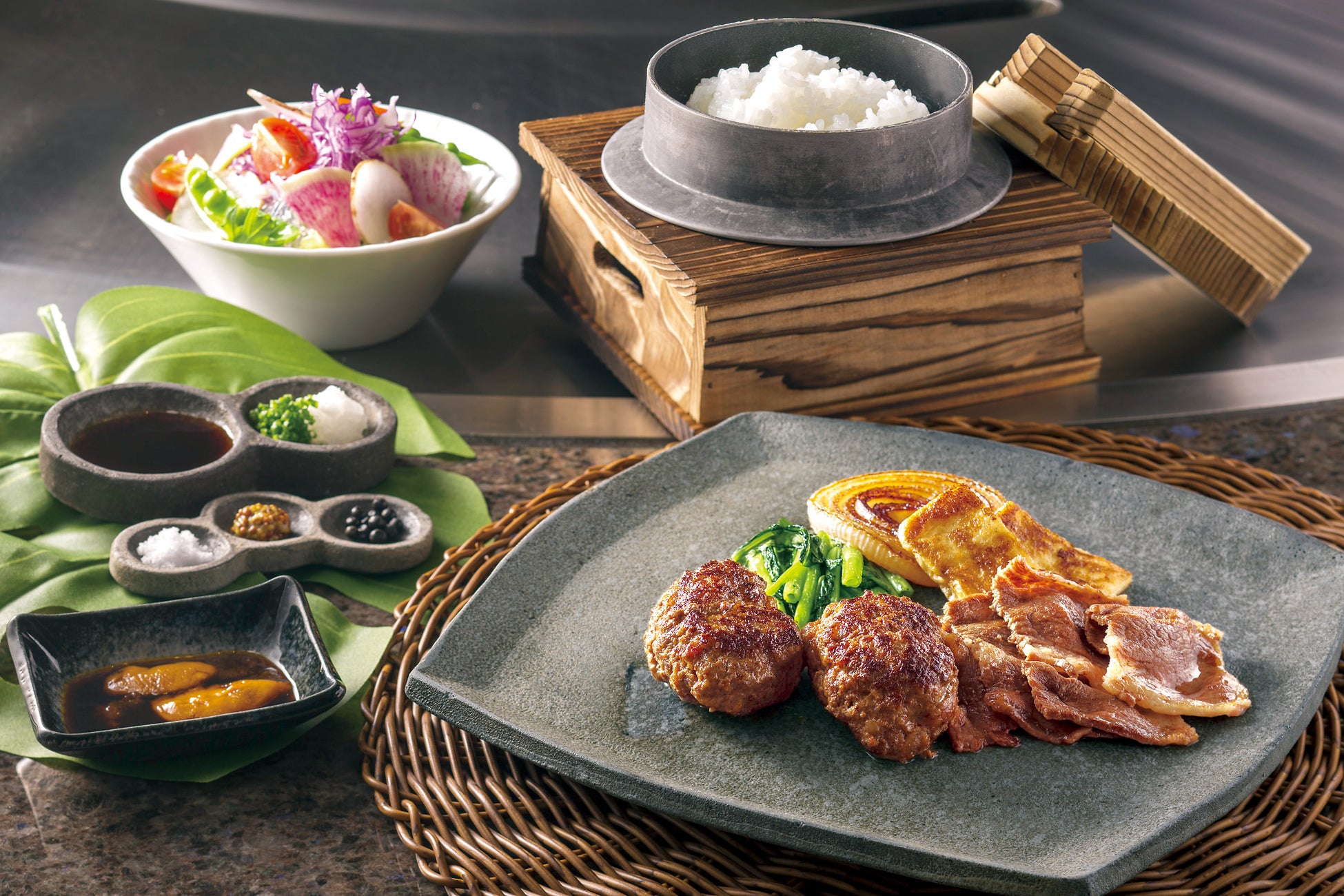 兵庫が誇る神食材・神戸ビーフのハンバーグがメイン。肉の挽き方、混ぜ方、焼き方など徹底的にこだわり完成したのは、肉々しさたっぷりで、甘い脂の香りが深い余韻を残す逸品。神戸ワインマスタードや赤穂の塩のほか、ウニ醤油を付けるとより贅沢な味わいに。ほかにも神戸ビーフスライスや淡路島産玉葱など兵庫食材の魅力が詰まった鉄板焼コースをぜひ。