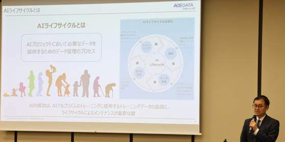 AOSデータでは、AIデータ加工サービス「AIデータアノテーション」や、AIデータのリスク管理を行なう「AIデータディリスキング™ ALM」、データの保存・共有・活用を支援する「AOS IDX」といった、AIライフサイクルを支える各種ソリューションを提供しています。