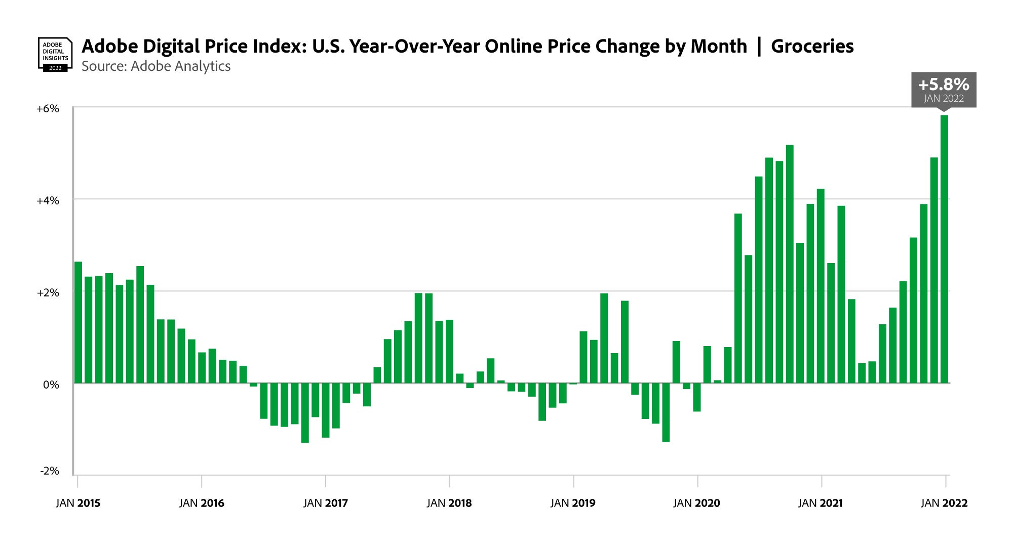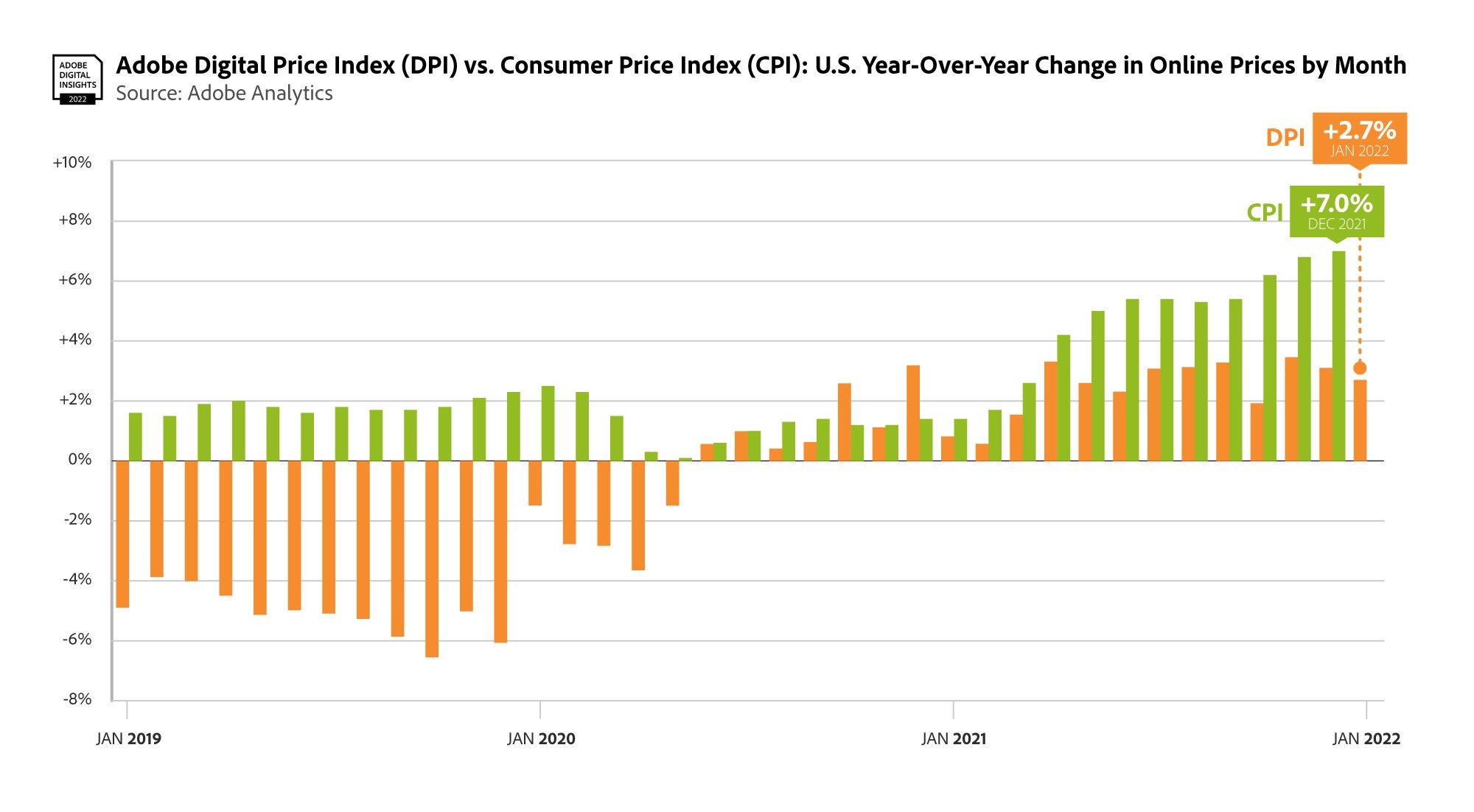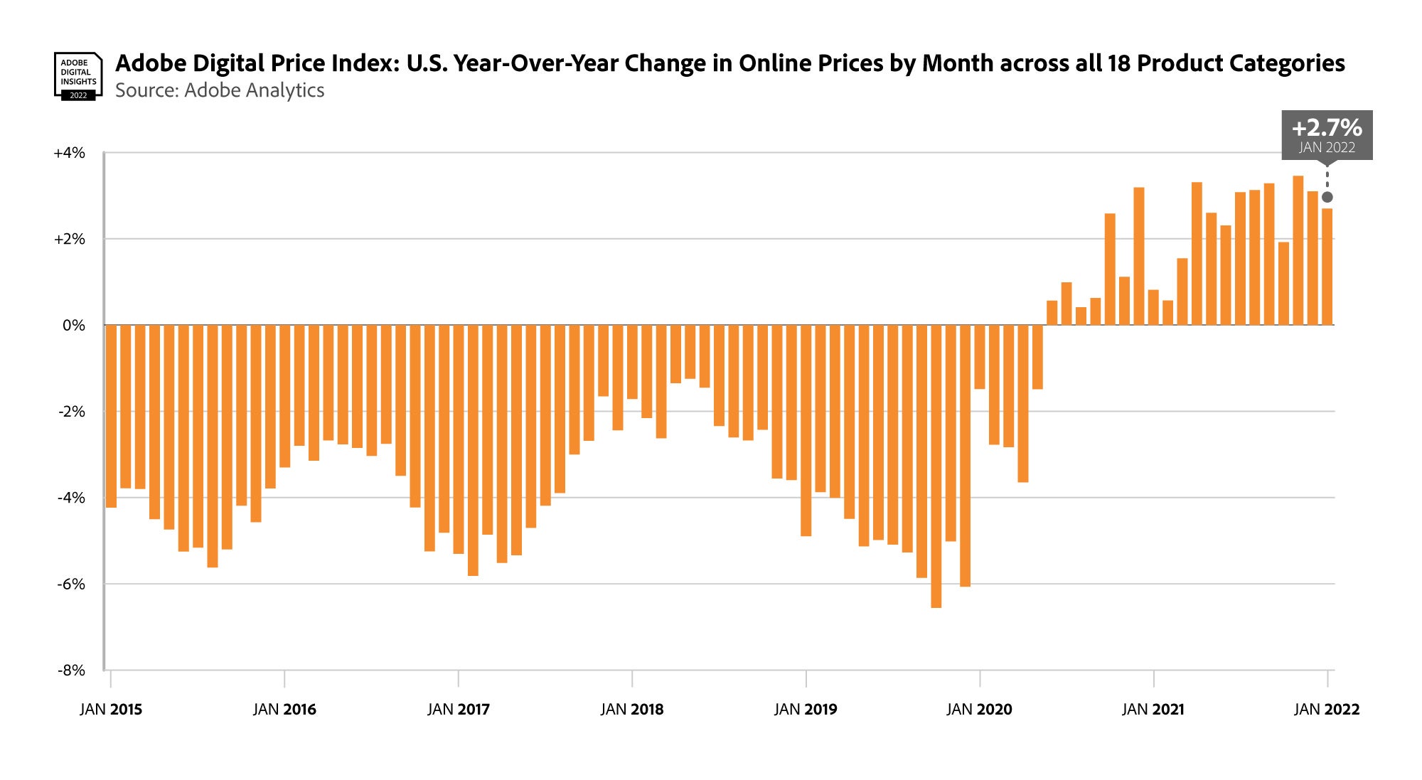 アドビ、「Adobe Digital Price Index」最新版を発表:2022年1月のオンラインインフレ率は2.7%と高水準を維持