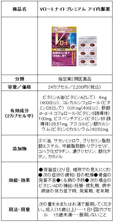 そこでこの度、夜間視力の低下(夜盲症)に効くビタミンAを基準※1内最大量※2配合した「Vロートナイトプレミアム アイ内服薬」を発売いたします。