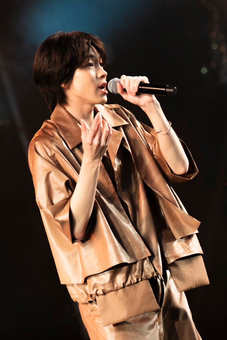 舞台のど真ん中でステップを踏みながら「♪愛がなくっちゃダメなのさ」と歌った「惑星ロマンス」。「たまには、一息ついて」とやさしく伝えた「でもね、たまには」では、「みんなの声も聴かせて」とクラップでリズムを取る会場と、シンガロングで共に過ごす時間を分かち合っていた。続くMCでは「この後は長岡花火さんということで、僕はトリ前でさっき話したら、緊張して縮こまっていました」と花火と〝対話〟したことを明かし、その様子についてレポートする場面もあった。