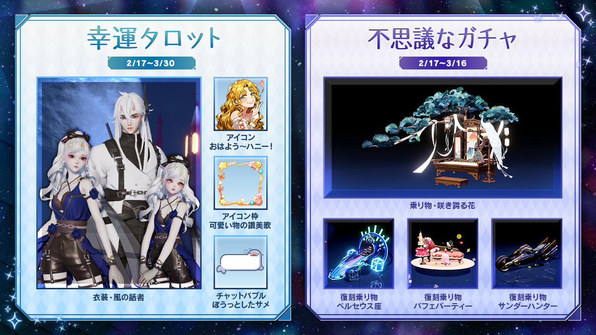イベント期間中に全ての「幸運タロット」カードをめくれば、必ず新登場の「服・風の話者」、「髪・風の話者」、「髪飾り・風の話者」、「アイコン枠・可愛い物の讃美歌」、「アイコン・おはようハニー」などの特別な限定レアアイテムを入手できます! さらに、「進化の石貯蔵箱」、「金竜の幸運パック」、「竜の末裔育成パック」などの豪華アイテムを獲得できます!