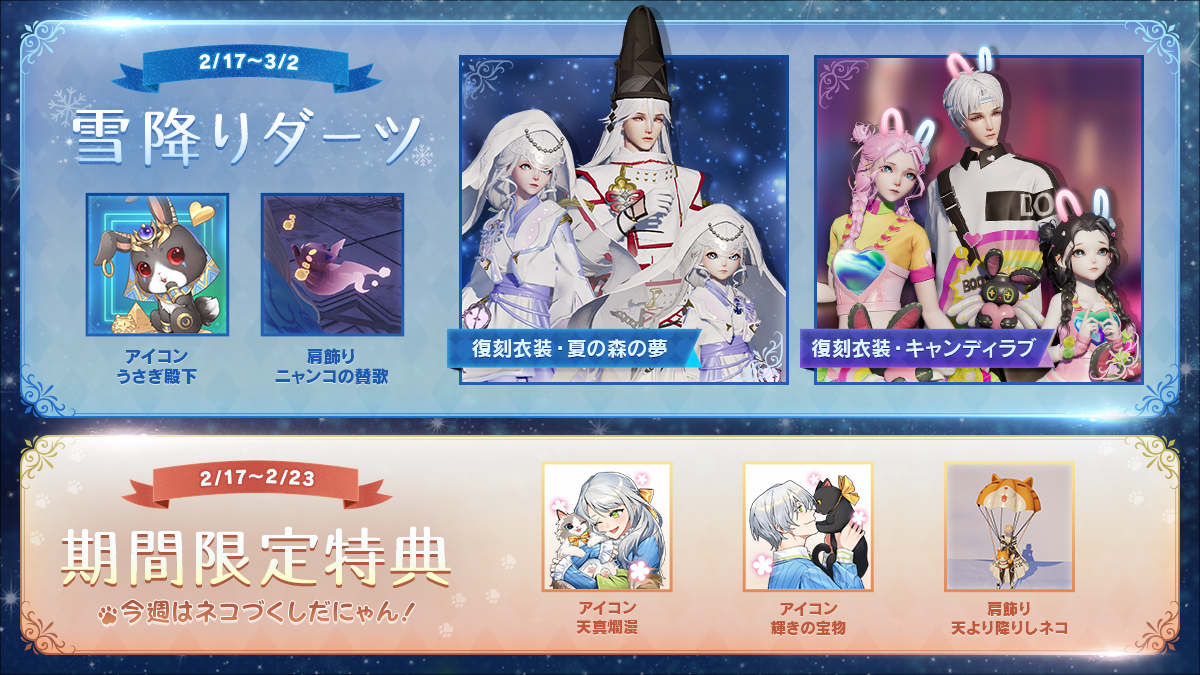 新たな7日間ログイン限定特典では「天真爛漫特典」、「輝きの宝物特典」、「永遠の誓約特典」、「猫の降臨特典」が登場! 各パックを購入すれば、お得なレアアイテムを入手できます。さらに、購入後に累計5日間ログインすれば、「アイコン・天真爛漫」や「アイコン・輝きの宝物」、「肩飾り・スイートサプライズ」、「肩飾り・猫の降臨」などのかわいいアクセサリーを獲得可能です!
