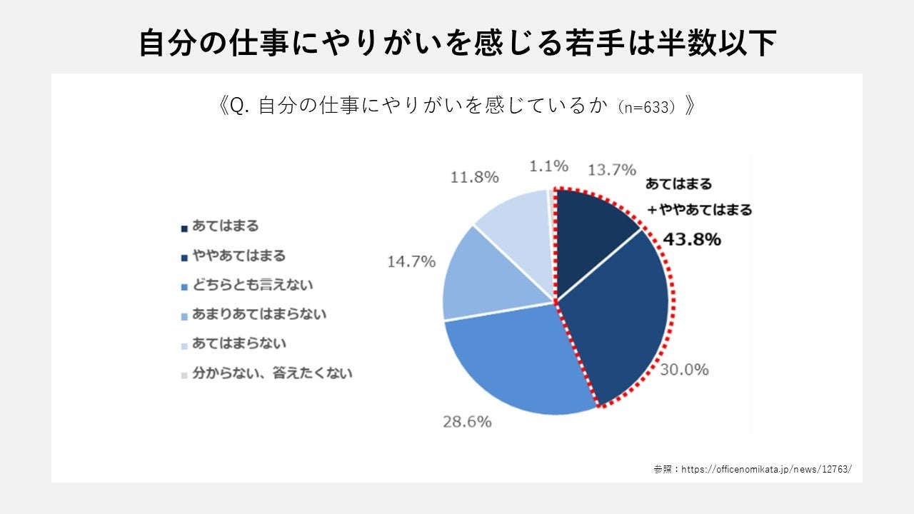 下のグラフでは、やりがいをもって働いている若手は半数に満たないことが示されている。