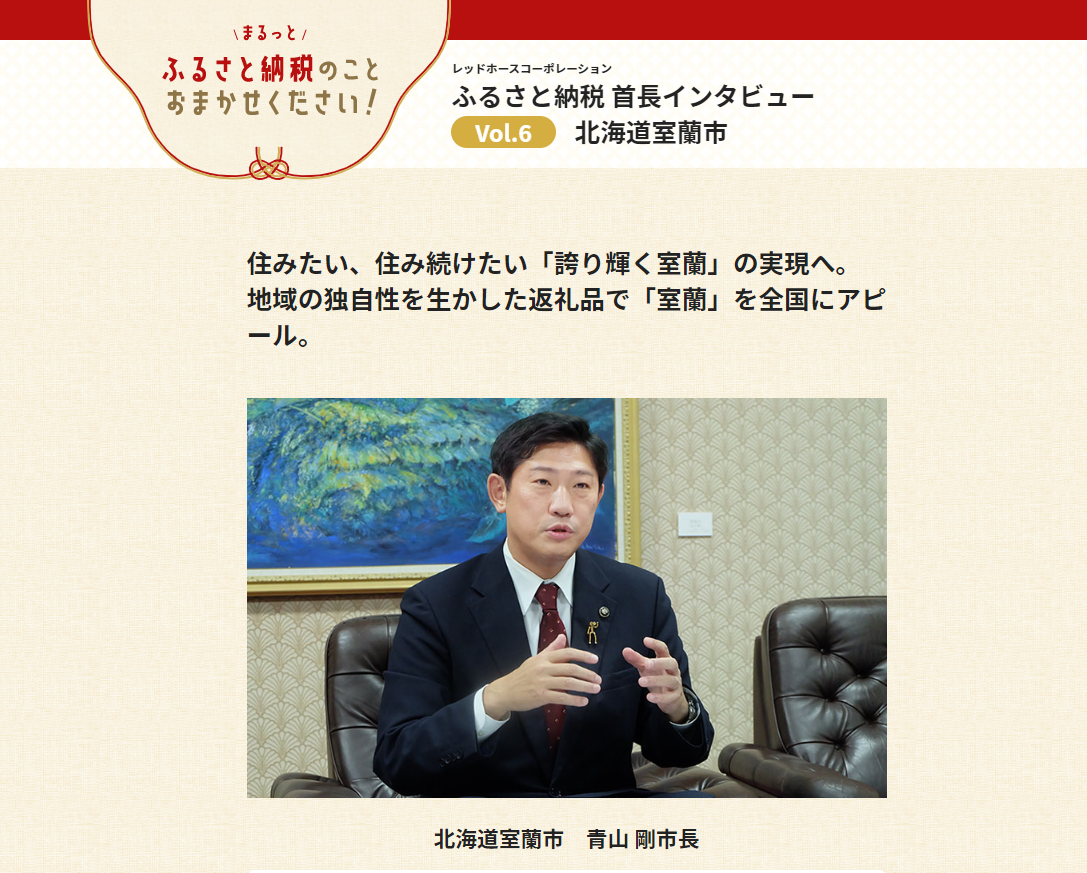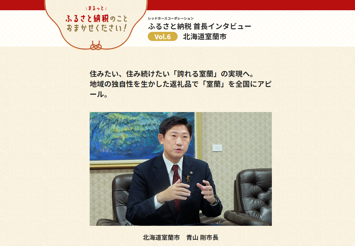 今回、さらなるサポートの一環として12月8日、当社のふるさと納税支援事業の契約先である全国各地の市区町村の首長に話を聞く「RHCふるさと納税首長インタビュー」シリーズ第6弾として室蘭市の青山 剛市長のインタビューを公開しました。歴史あるまちを生かした新たな返礼品の開発など、熱く語ります。