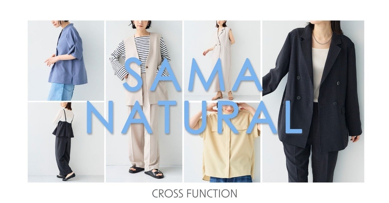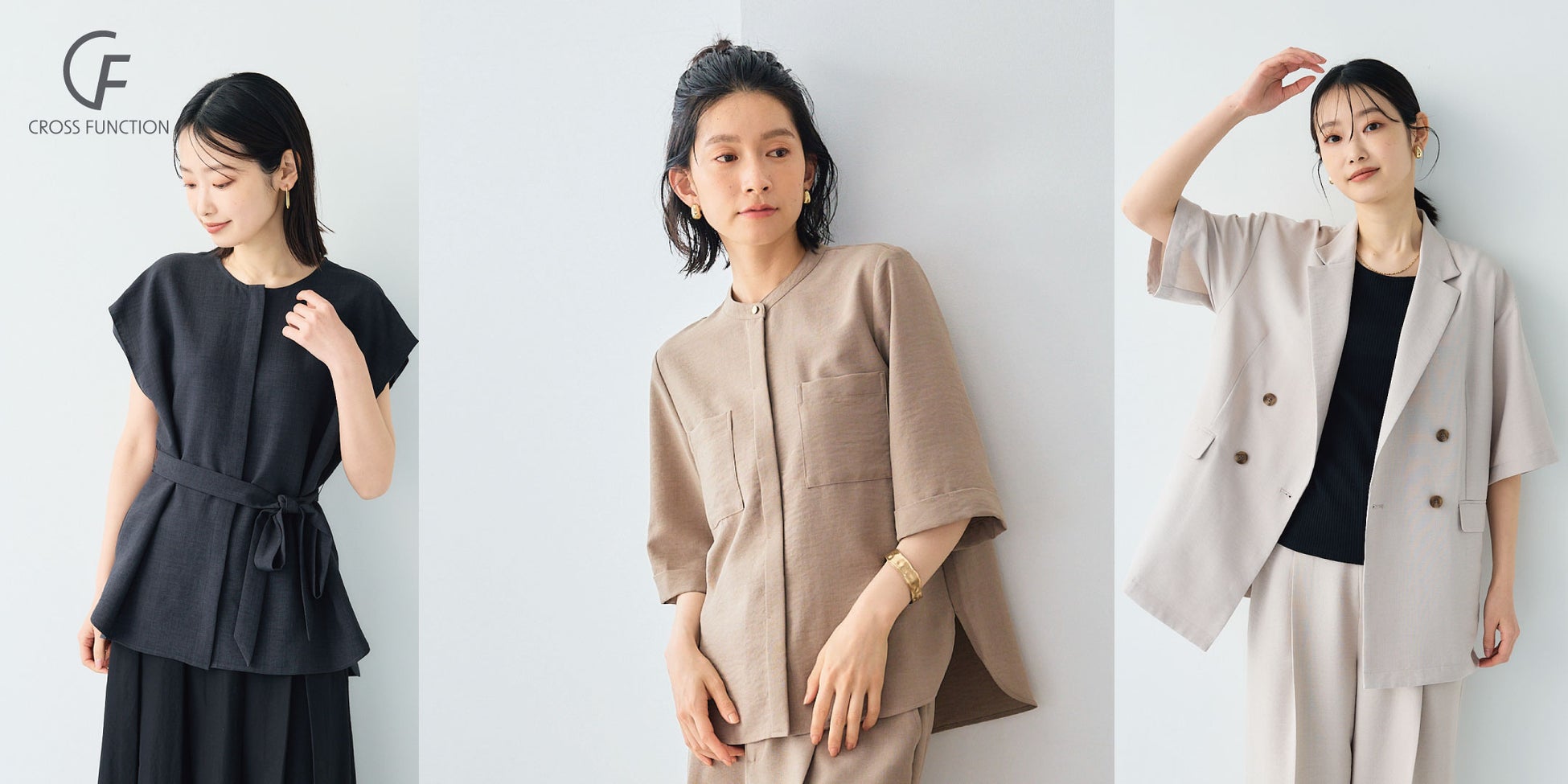 「CROSS FUNCTION(クロス ファンクション)」は、累計20万枚販売(※)の実績があり、昨年から人気のある「サマナチュラ」のリネンライクシリーズから、一部新色「モカ」を含めたブラウス3型、ハーフスリーブジャケット、ワイドパンツの5型をオンラインストアにて追加販売を開始、一部欠品していた人気商品も再販を開始いたしました。
