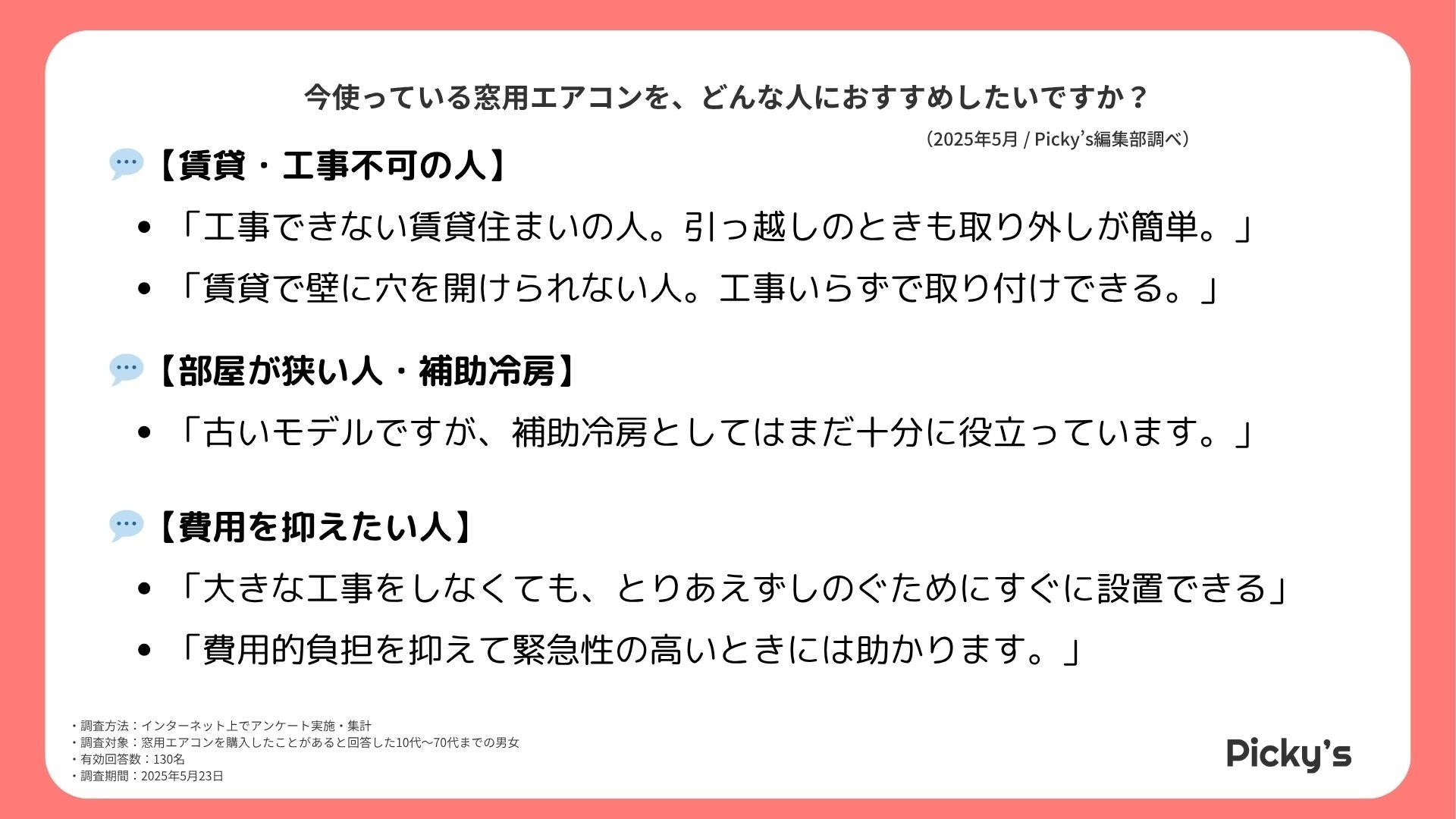 Picky’sでは、窓用エアコンの購入・使用経験があるユーザーを対象にアンケート調査を実施しました。調査の結果、購入理由として最も多かったのは「賃貸で工事ができないため」、また「手軽さ」「コスパの良さ」も高く評価されていました。