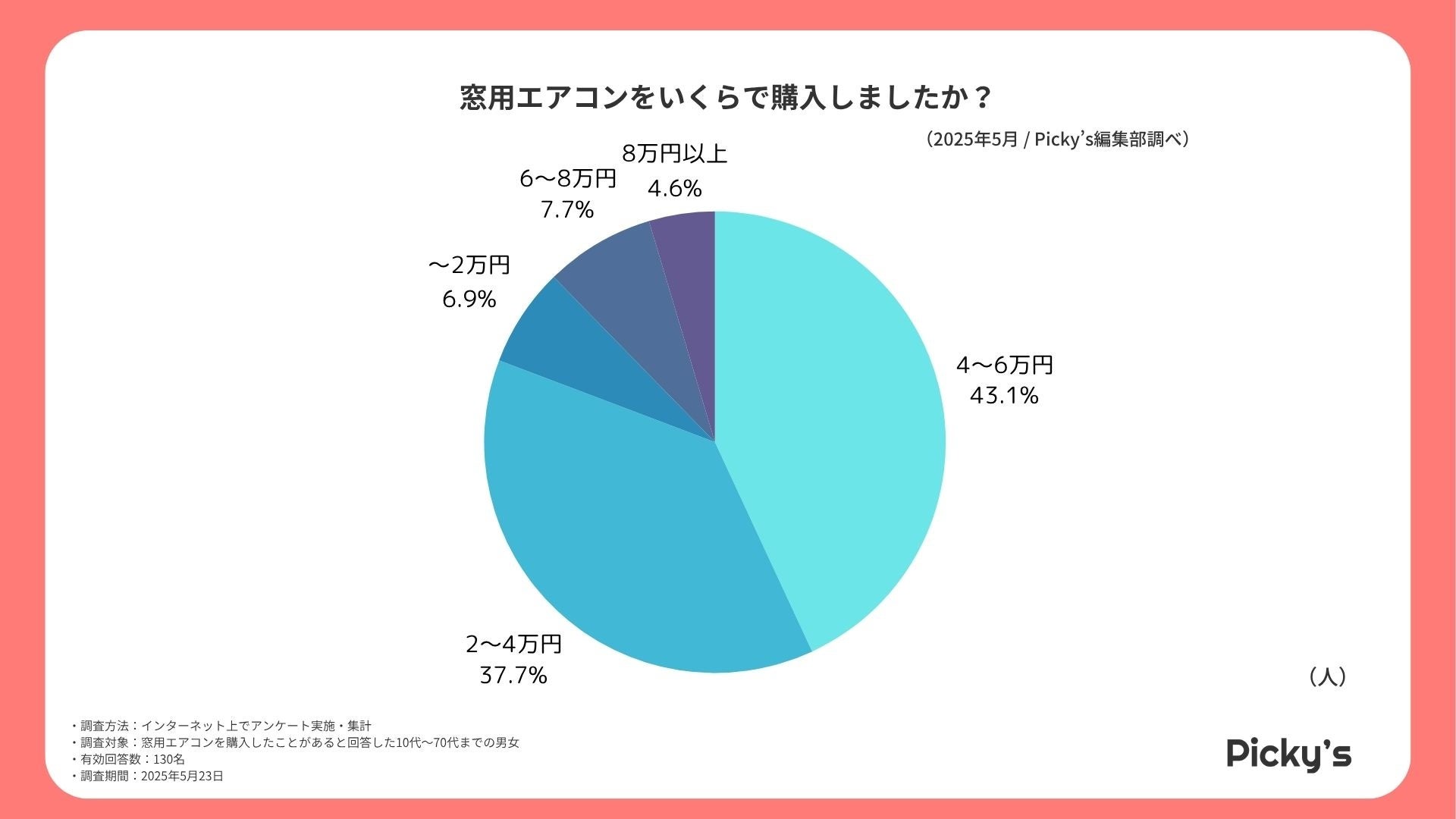 窓用エアコンの購入価格帯として最も多かったのは「4〜6万円」で、全体の約43%を占めました。