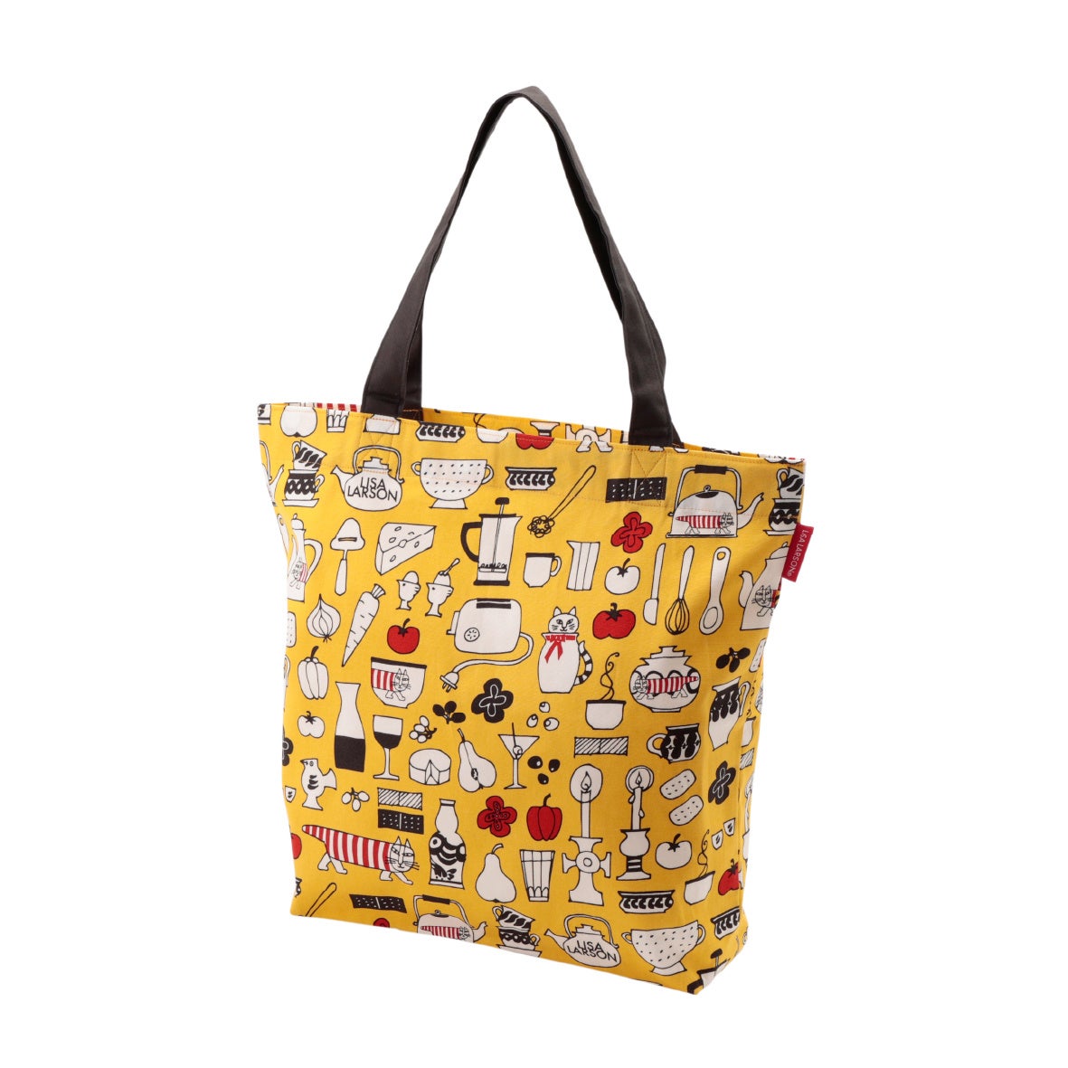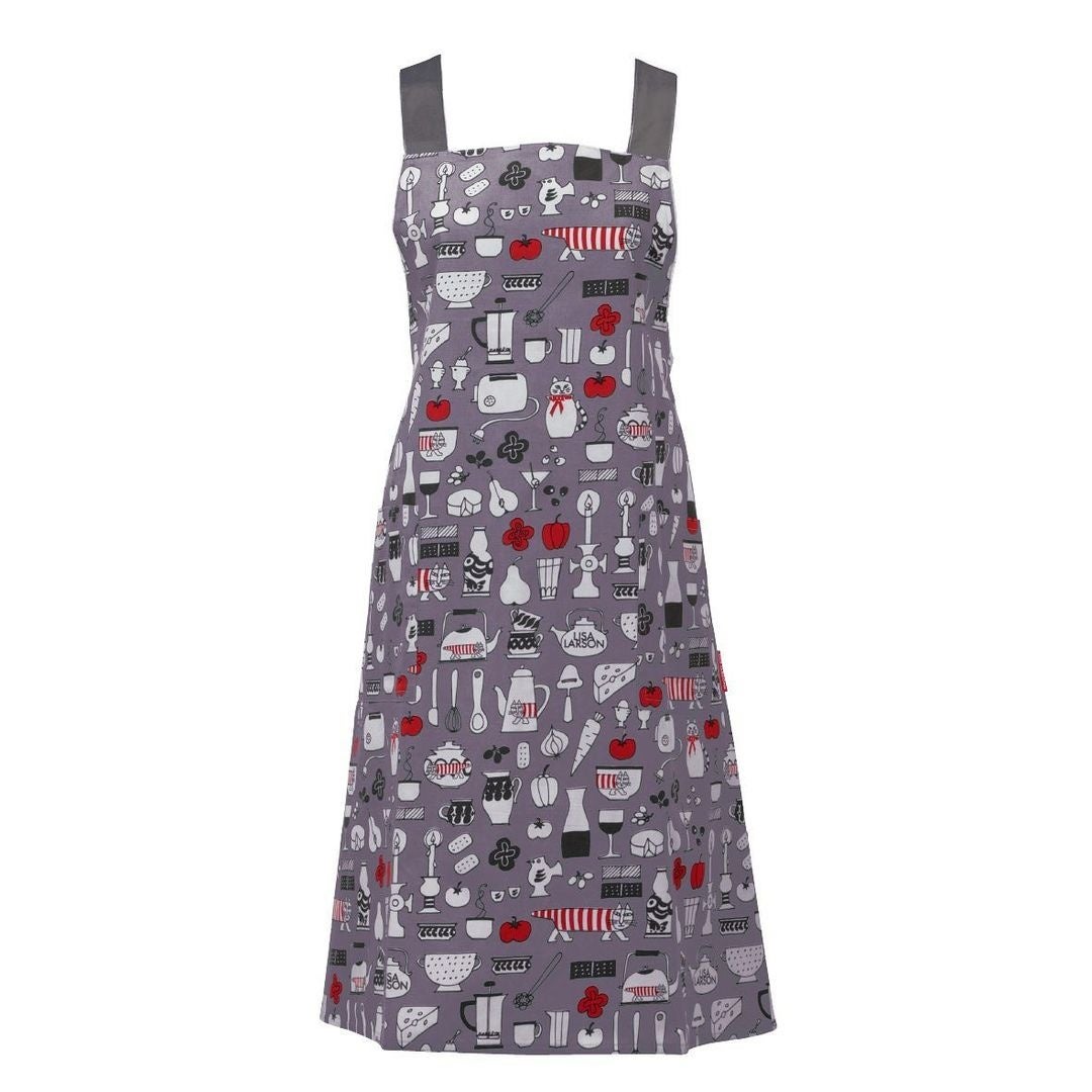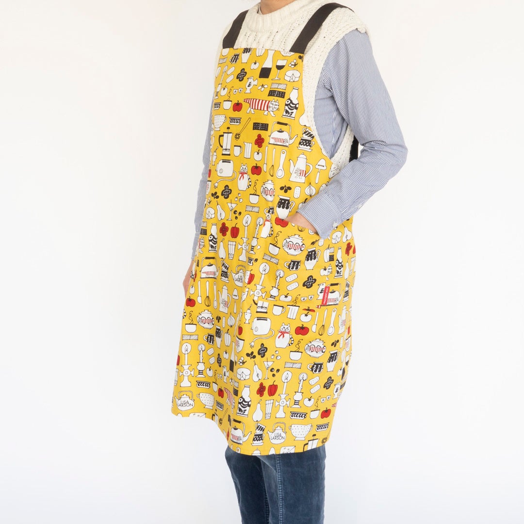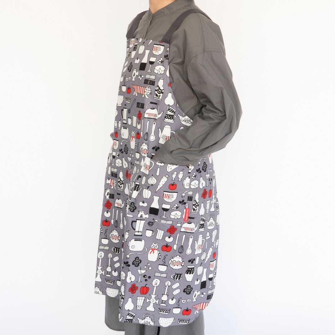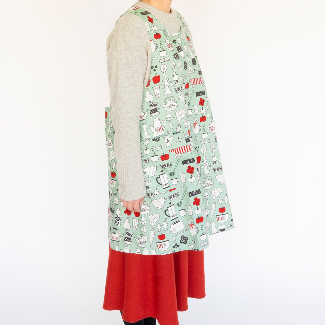 「マイキーキッチン」デザインには、ワインやチーズなどのフードやテーブルウェアをはじめ、リサのヴィンテージ作品を思わせるアイテムに、ジャパンシリーズのおさけとりまで!あちらにもこちらにも、ヨハンナの遊び心が見え隠れしている楽しいデザインのエプロンに仕上がっています。