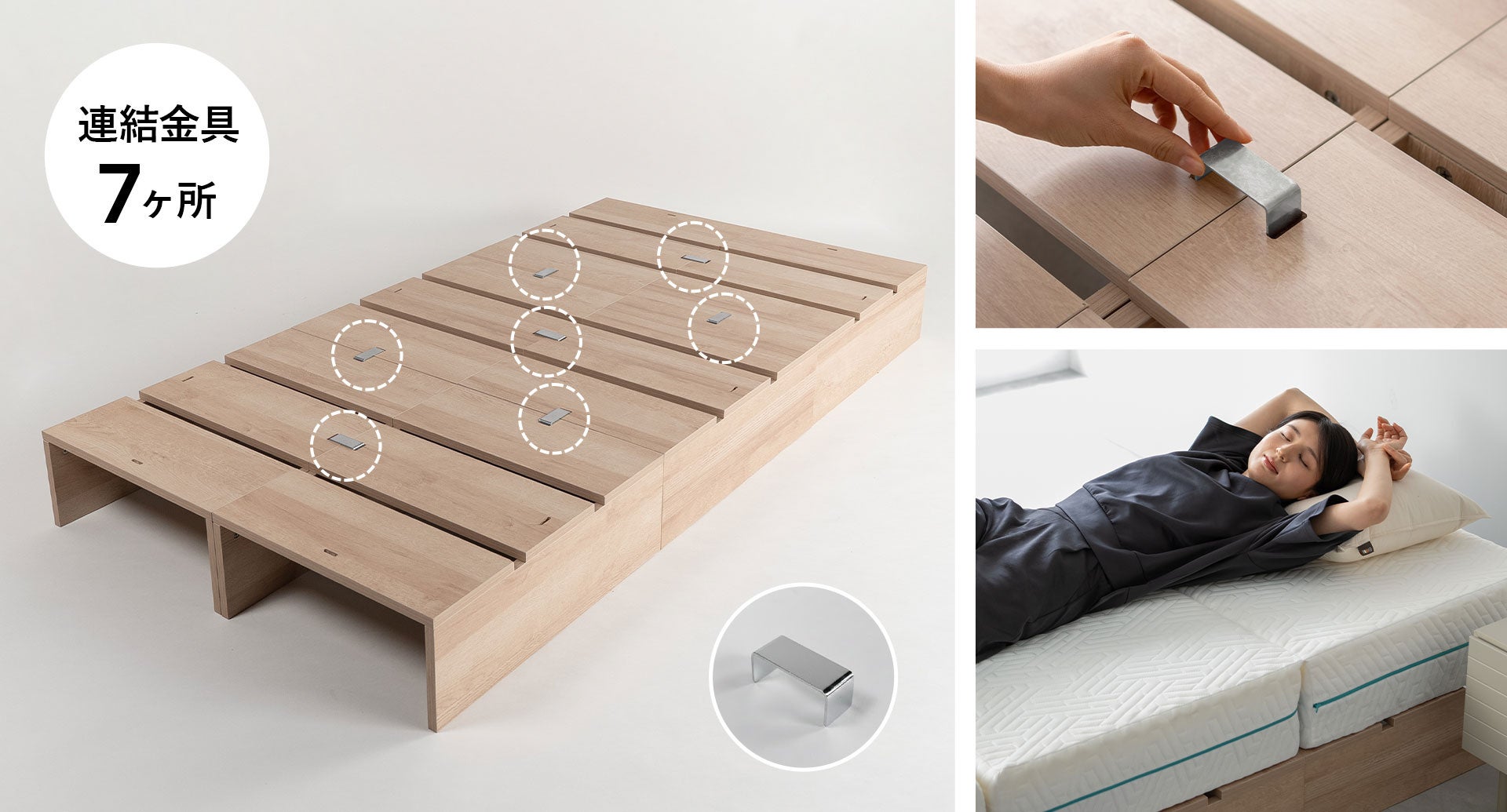 パレット構造による単身での移動しやすさや拡張性はそのままに、強化連結設計で安定性をプラス。シンプルさと使い勝手を求める、現代の都市生活に最適化された新しいベッドのカタチです。