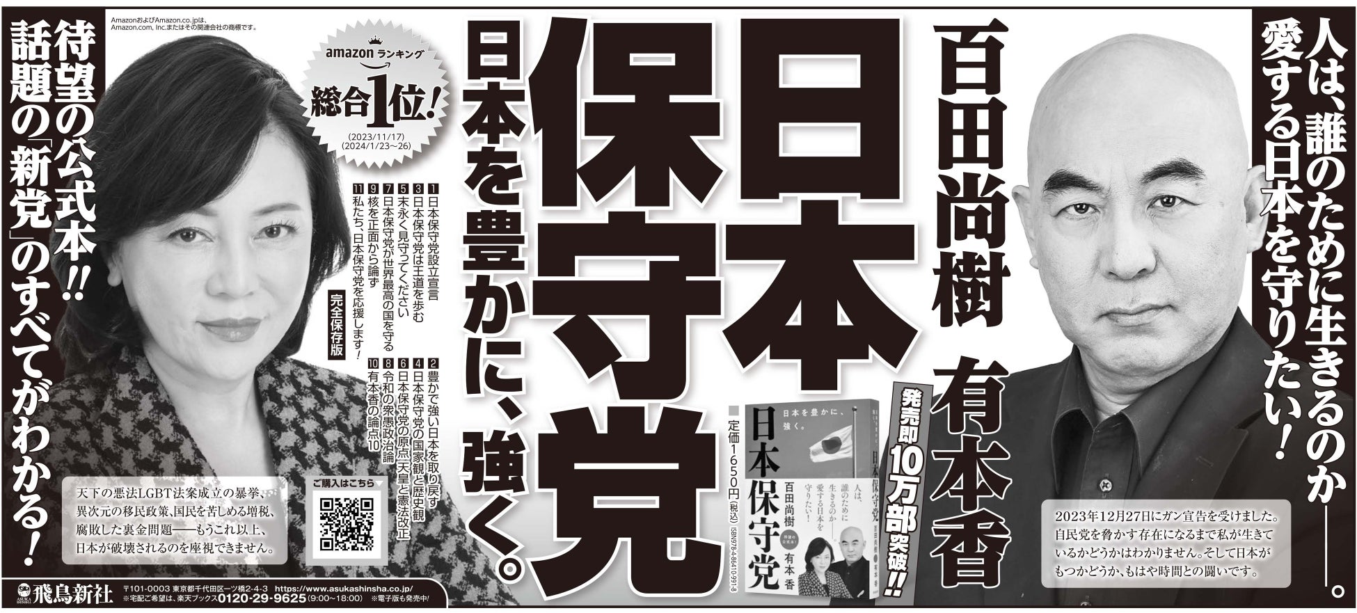 百田尚樹氏と有本香氏の共著『日本保守党 日本を豊かに、強く。』が早くも11万部を突破!「政治・政党」関連書籍の売り上げでは他の政治家、政党を圧倒。“与党第一党”との声も。