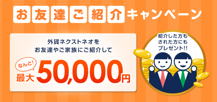 すでに『外貨ネクストネオ』を開設しているお客様(「ご紹介者様」)が、『外貨ネクストネオ』に興味をお持ちの方(「お友達」)を紹介していただき、後日その「お友達」が条件(『外貨ネクストネオ』にて10万円以上の入金(※1)および、合計5万通貨(※2)以上の新規取引)を満たされた場合には、「ご紹介者様」と「お友達」の双方にもれなく現金10,000円をプレゼントいたします。