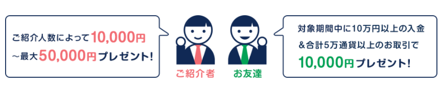 うち「ご紹介者様」については、本キャンペーンの適用対象となる「お友達」の上限を5名様までとし、そのすべてが条件を満たした場合には合計50,000円を獲得できます。