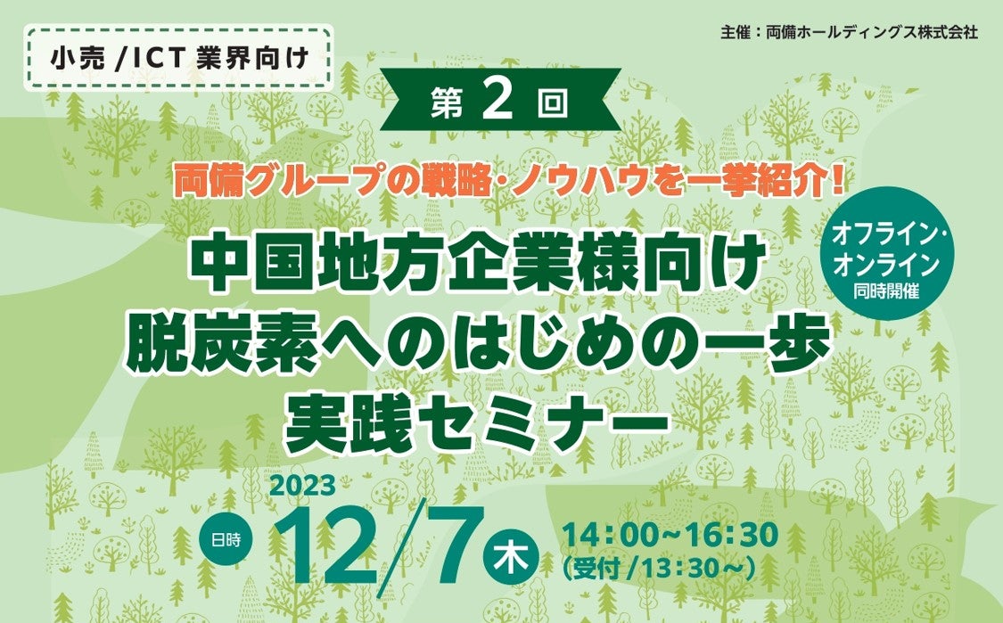 この度、 「両備グループの戦略・ノウハウを一挙紹介! 中国地方企業様向け脱炭素へのはじめの一歩実践セミナー」の第2回目を、 2023年12月7日(木)中国地方の小売・ICT業界を対象に開催することになりました。つきましては、セミナーにご参加いただける企業の募集を2023年10月16日(月)より開始いたしますのでお知らせします。
