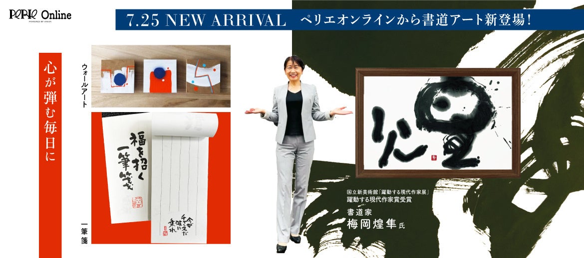今回ペリエオンラインにて「一筆箋」と「ウォールアート」をラインナップ。一筆箋は梅岡氏の書道の素晴らしさを見込まれ、官公庁から直接依頼があって梅岡氏直筆の書を印刷した一冊のコミュニケーションレターとして生み出された逸品。ウォールアートはお部屋を彩る一点もののアート作品です。