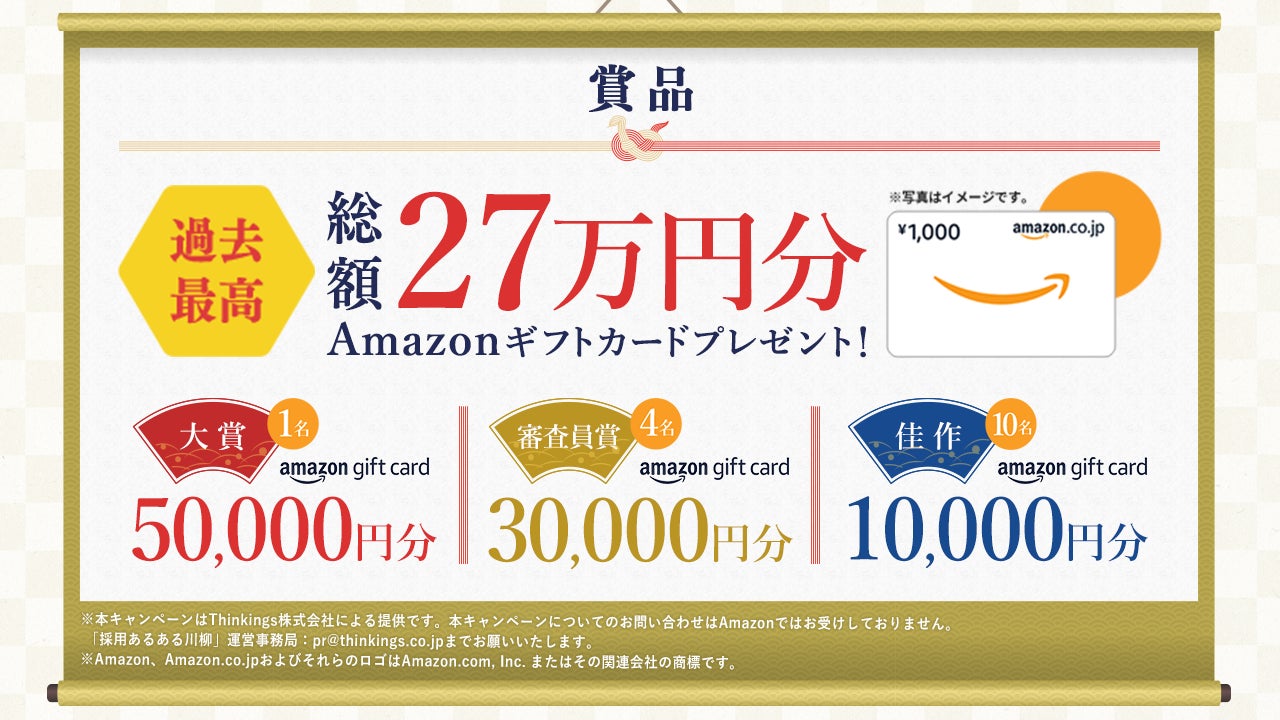 ※本キャンペーンはThinkings株式会社による提供です。本キャンペーンについてのお問い合わせはAmazonではお受けしておりません。「採用あるある川柳」運営事務局:pr@thinkings.co.jpまでお願いいたします。