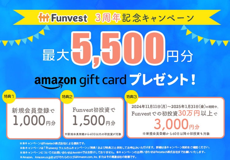 本ファンドへ出資していただいた投資家の皆様を対象として、出資額に応じて最大15,000円分のAmazonギフトカードをプレゼントするキャンペーンも併せて実施いたします。