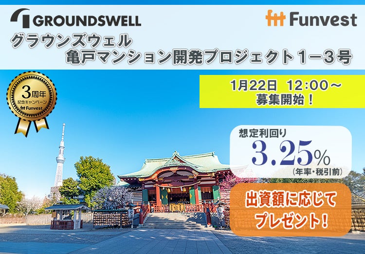 「未来をわかちあう投資」を提供する「Funvest(ファンベスト)」(以下、Funvest)は、「グラウンズウェル 亀戸マンション開発プロジェクト1-3号」(以下、本ファンド)の募集を1/22より開始しますので、お知らせいたします。