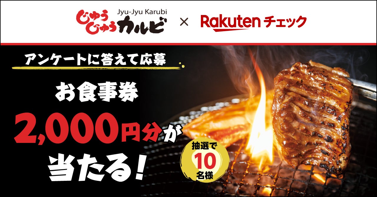 本キャンペーンでは、期間中に「楽天チェック」アプリ内のキャンペーンページより、簡単なアンケートに回答した方の中から抽選で10名様に「じゅうじゅうカルビ」のお食事券2,000円分を進呈します。