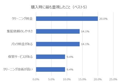 また、宅配クリーニングの利用時に最も重視したことは「クリーニング料金」 が20.0 %と最多、「集配依頼のしやすさ」「パック料金がある」と続きました。1回あたりの平均利用金額は「5000円~1万円未満」(26.6%)、「1万円~1万5000円未満」(19.1%)、「3000円~5000円未満(16.0%)」の順となりました。