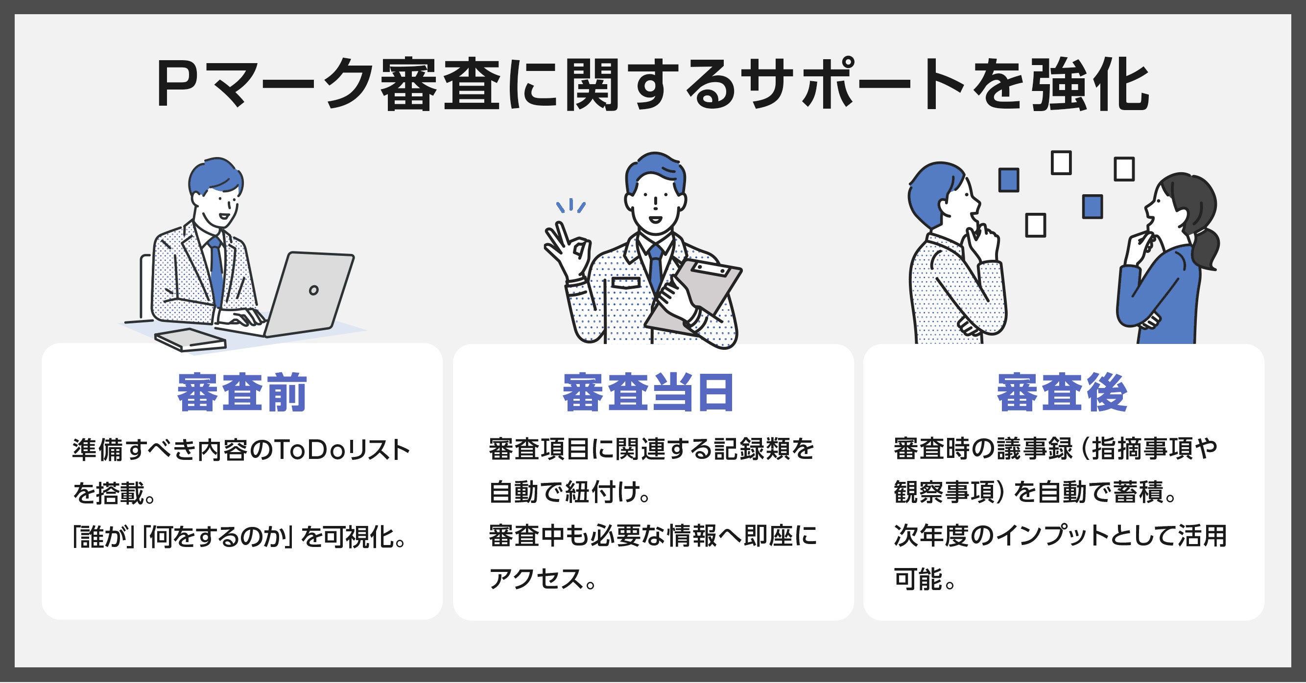 今回のアップデートにより、これまで『ISMSアシスト』、『9001アシスト』、『14001アシスト』といったISO管理ツールに搭載されていた「審査準備」機能が、『Pマークアシスト』にも拡充され、「アシスト」シリーズ全製品でご利用可能となりました。