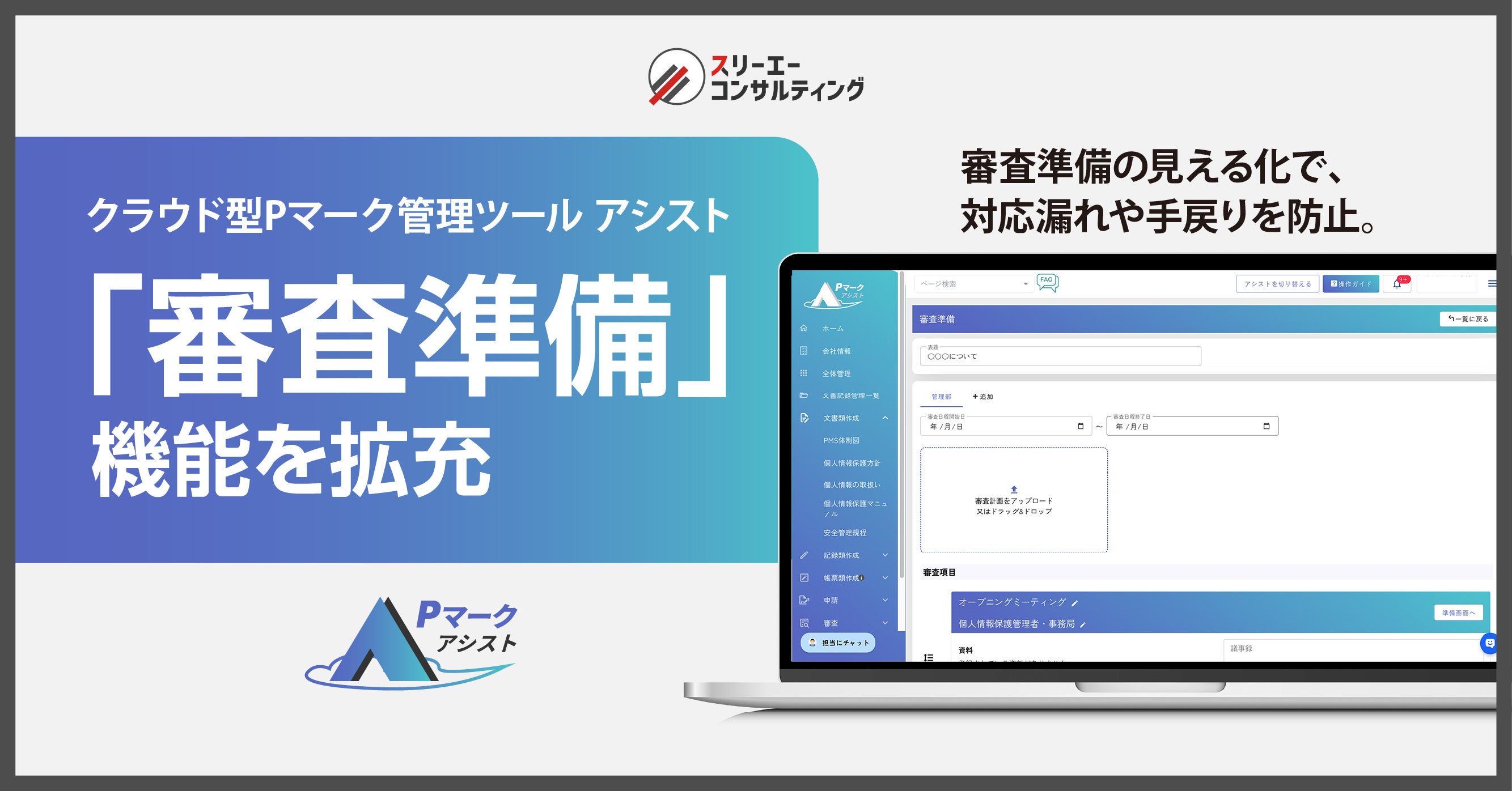 Pマーク、 ISOコンサルにおける支援実績 No.1(注1)のISO/Pマークの取得・運用支援サービス「認証パートナー」を提供する株式会社スリーエーコンサルティング(本社:大阪府大阪市、代表取締役社長:竹嶋 寛人)は、このたび、当社が提供するクラウド型Pマーク管理ツール『Pマークアシスト』において、「審査準備」機能の拡充およびアップデートを実施いたしました。