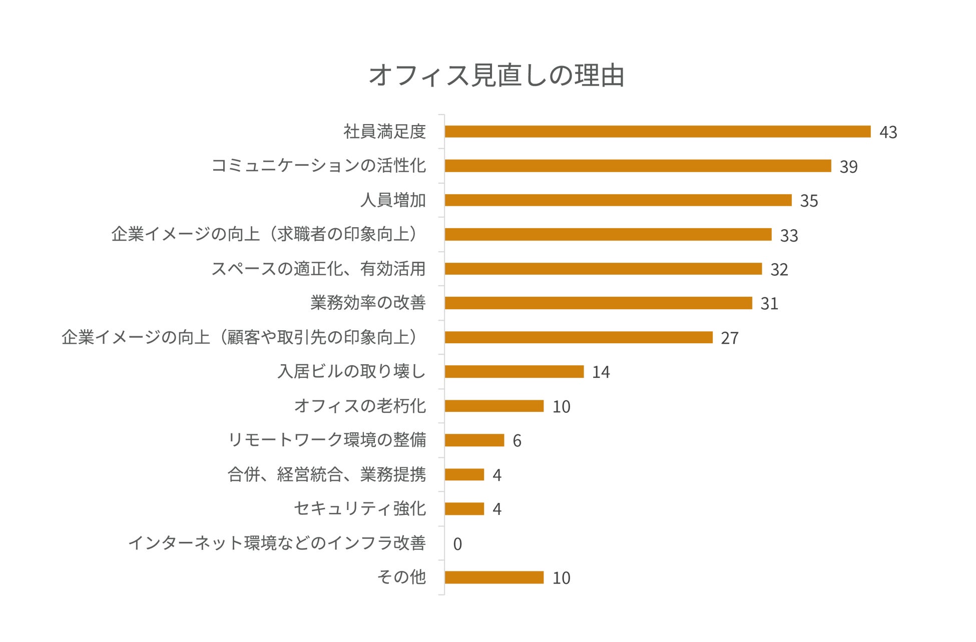理由として「社員満足度」が最も多く、次いで「コミュニケーションの活性化」「人員増加」という結果になりました。「社員満足度」が最も多かったということは、人的資本経営に注目が集まる中で、社員に寄り添ったオフィスや働き方を模索する企業が増えているということがわかります。