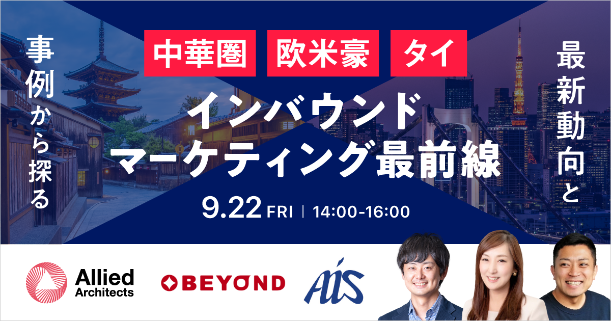 そこで今回、インバウンド施策を検討中・実施中の日本企業向けに、”地方創生×インバウンド×デジタルマーケティング”をテーマに全国で300以上もの自治体や企業のインバウンド・海外向けSNS・デジタルマーケティングを手掛けるビヨンドと、タイ向けのインバウンドプロモーション支援を行うAISとの3社共同で、インバウンド観光客の多い中華圏・欧米豪・タイにスポットを当て、最新の市場動向やインバウンド需要の現状、効果的な施策や企業事例を紹介しながら今実施すべきインバウンド施策を解説する無料セミナーを開催いたします。