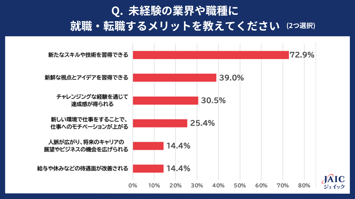 「未経験の業界や職種に就職・転職するメリットを2つ選択してください」と質問したところ、1位「新たなスキルや技術を習得できる」が72.9%、2位「新鮮な視点とアイデアを習得できる」が39.0%、3位「チャレンジングな経験を通じて達成感が得られる」が30.5%、4位「新しい環境で仕事をすることで、仕事へのモチベーションが上がる」が25.4%、5位「人脈が広がり、将来のキャリアの展望やビジネスの機会を広げられる」「給与や休みなどの待遇面が改善される」が同率で14.4%となりました。