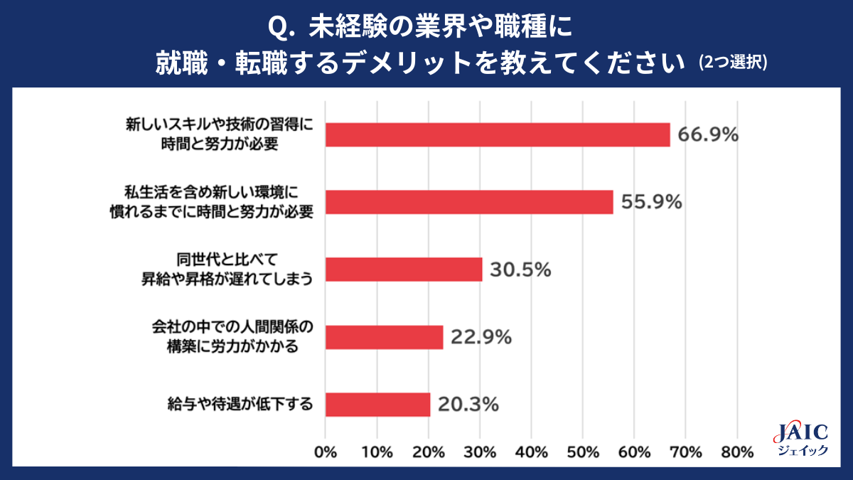「未経験の業界や職種に就職・転職するデメリットを2つ選択してください」と質問したところ、1位「新しいスキルや技術の習得に時間と努力が必要」が66.9%、2位「私生活を含め、新しい環境に慣れるまでに時間と努力が必要」が55.9%、3位「同世代と比べて、昇給や昇格が遅れてしまう」が30.5%、4位「会社の中での人間関係の構築に労力がかかる」が22.9%、5位「給与や待遇が低下する」が20.3%となりました。