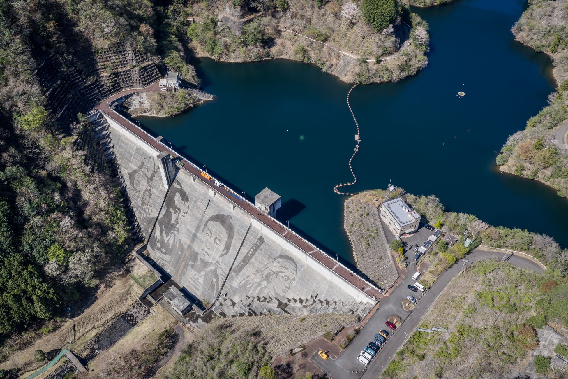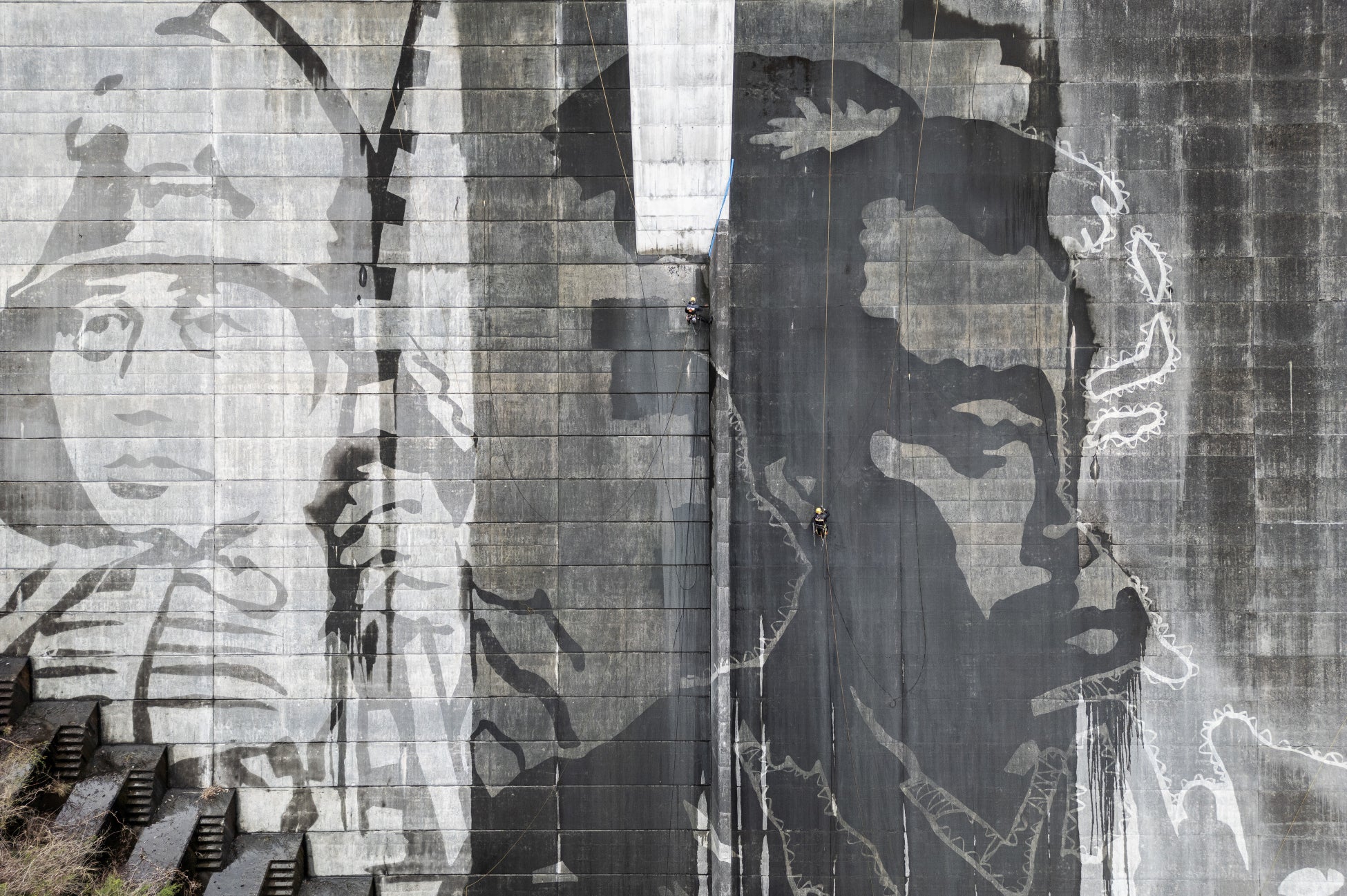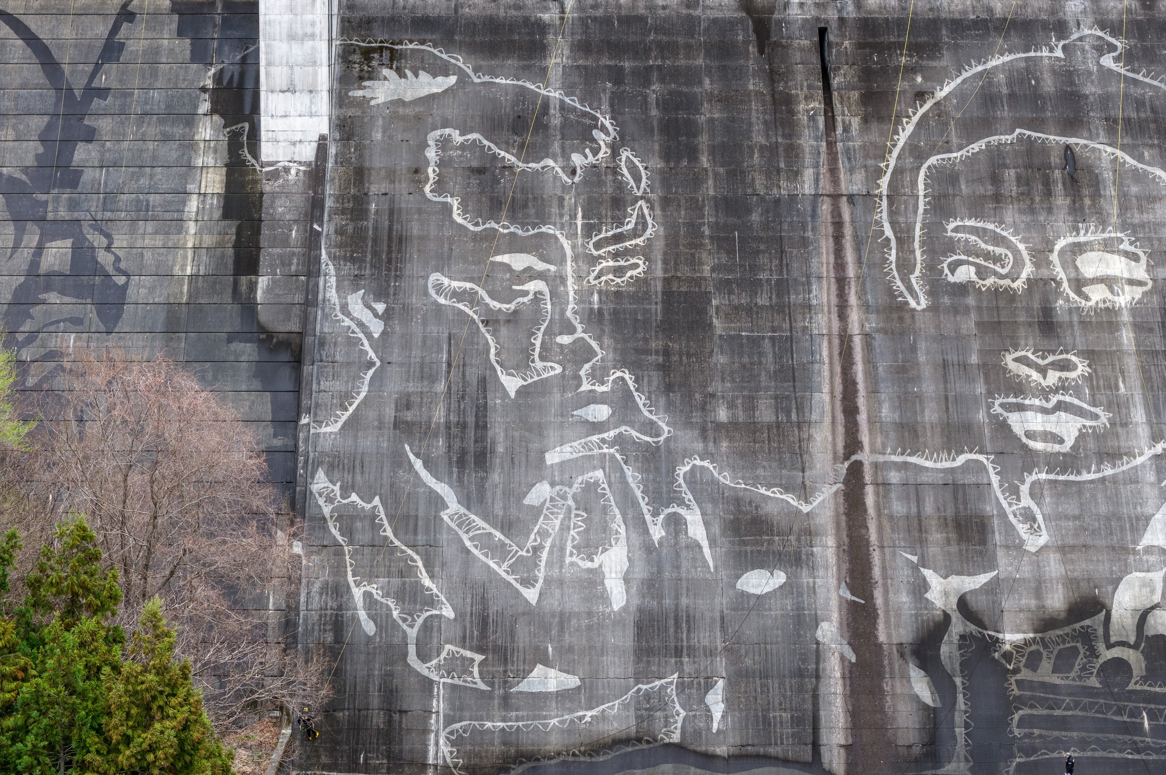 松田川ダムでのリバース・グラフィティプロジェクトが遂に完成しました。アーティストのKlaus Dauvenと共に素晴らしい成果を上げられたことを、チーム一同誇りに思っています。今回の作業で最も困難だったのは、巨大な壁面にモチーフの輪郭を描く工程でした。2,000 点以上の測量ポイントを正確に繋ぎ、アーティストが意図した繊細な「顔の表情」を忠実に再現することに細部までこだわり抜きました。苦労の甲斐あって、最終的な仕上がりは息をのむほど美しく、見事なものとなっています。
