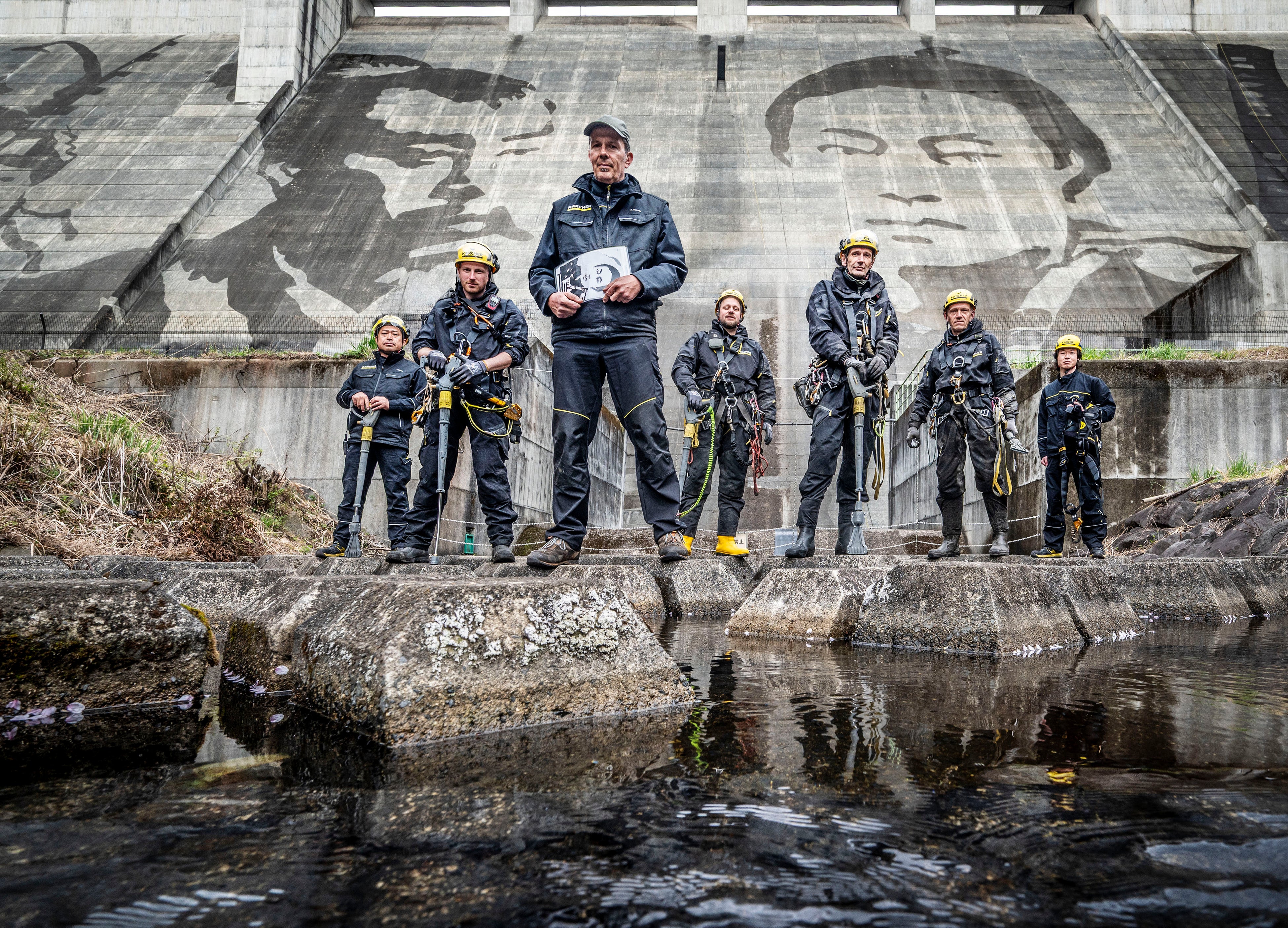 栃木県足利市の松田川ダムで、18 年ぶりにケルヒャーと協力しダムアートを制作しました。今回のモチーフデザインとして着目したのは、足利市の伝統行事に登場する侍です。彼らは単なる英雄ではなく、生と死を見つめるような思索的な表情をしており、その姿に強く惹かれました。約 20 年かけて蓄積した苔を部分的に洗浄し、特に印象的な 4 人の侍の顔を巨大なスケールで描き出しています。このリバースグラフィティという技法を通じて、遠い過去の記憶を現代に呼び起こし、普遍的な感情を表現できることは大きな