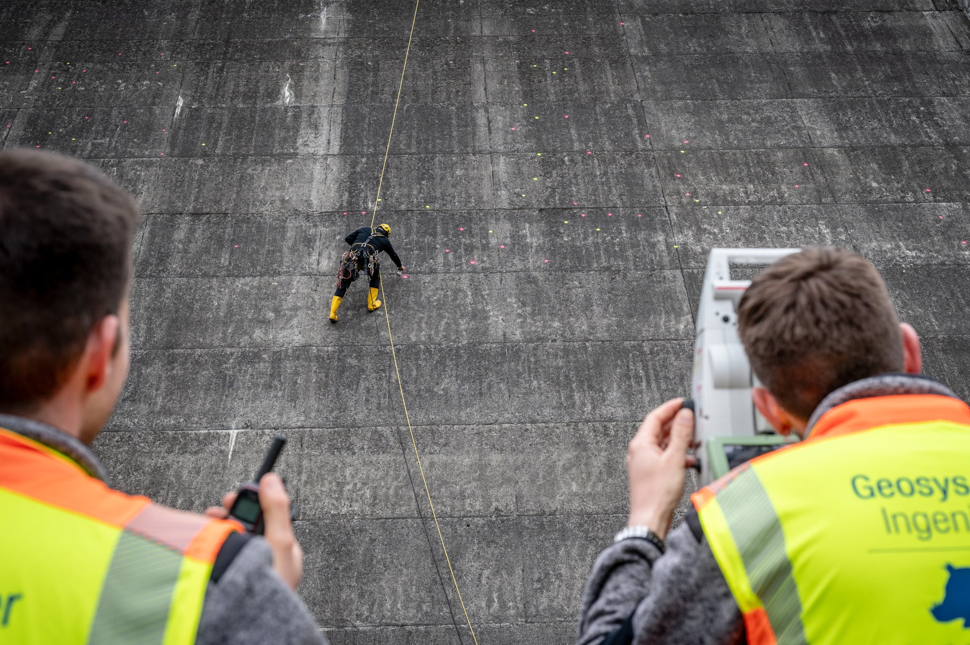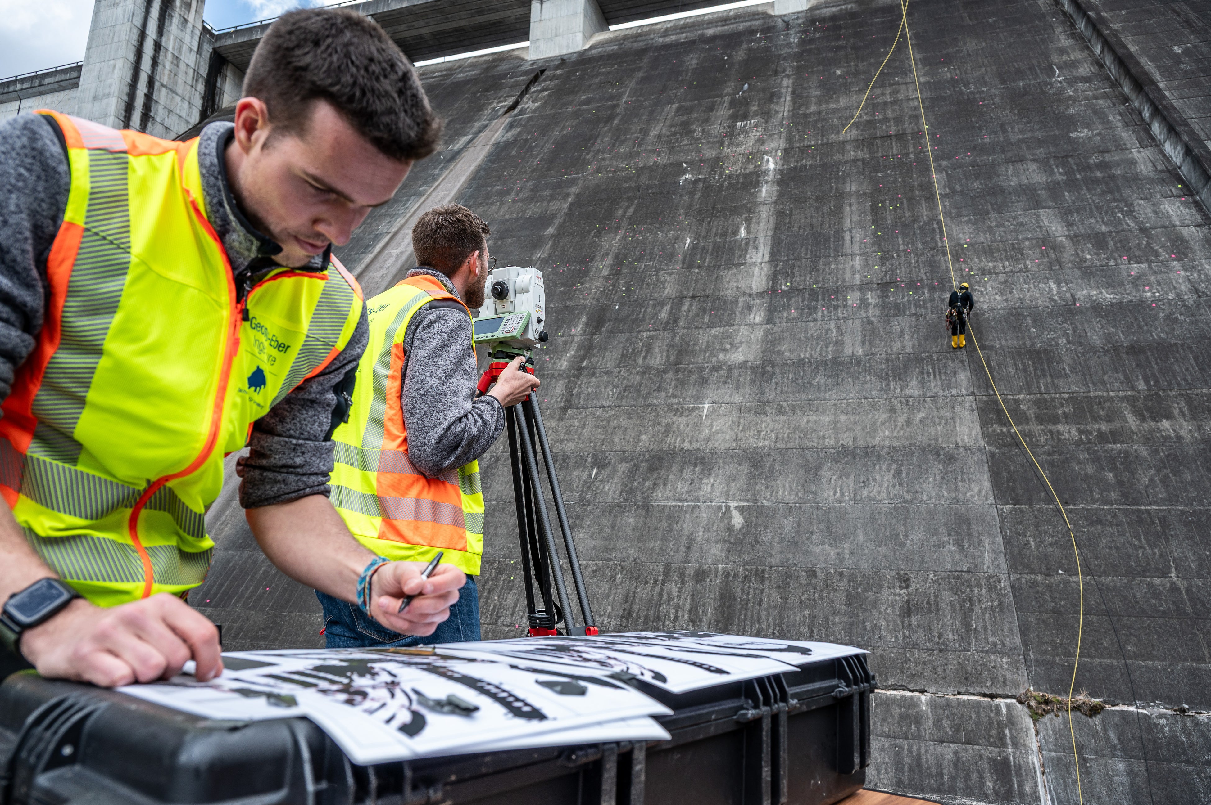 モチーフをレイアウトした立面図をもとにレーザーなど最新機器により実際のダムの壁面を正確に測量します。測量結果をもとに、洗浄チームと測量チームのチームワークで、縁取りのためのポイントをマーキング。これまでのダムアートでは、平均1,000から1,500ポイント程度ですが、今回のアートは、ディテールを表現するために、約 2,055 とかなり多いポイントがマーキングされました。