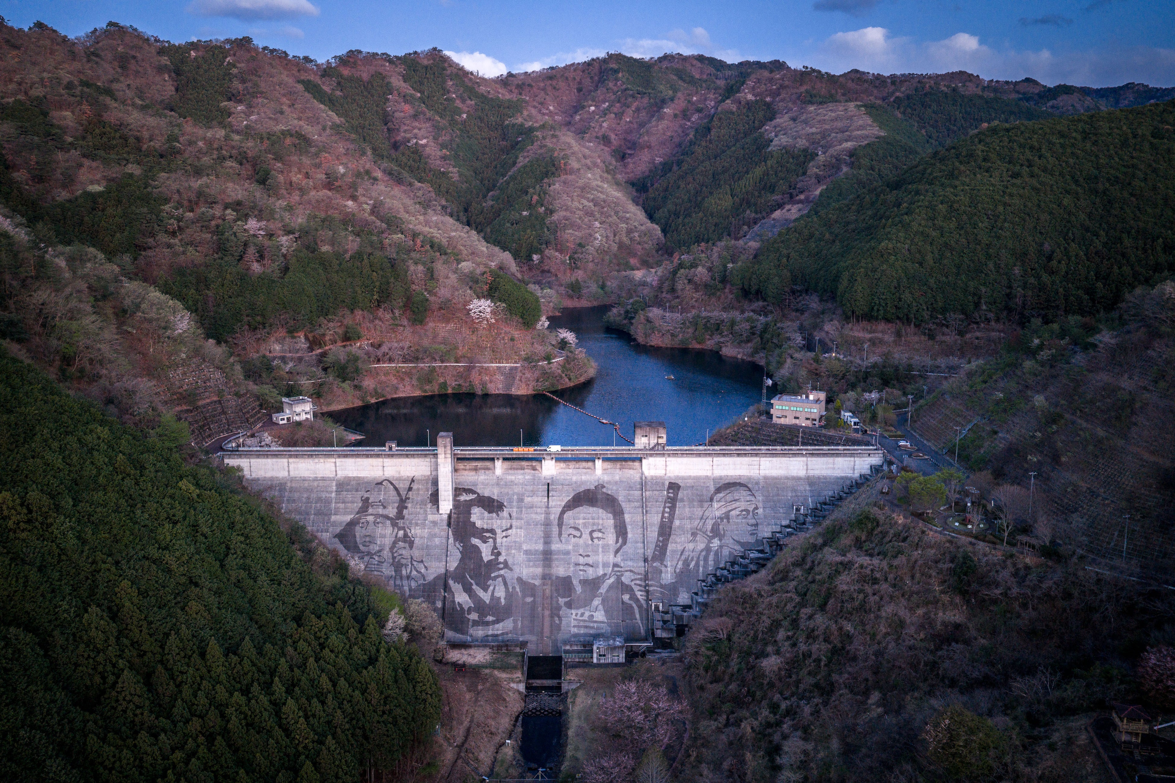 今年30周年を迎えた松田川ダムをキャンバスに描く巨大な『侍』の洗浄ダムアートがついに完成!