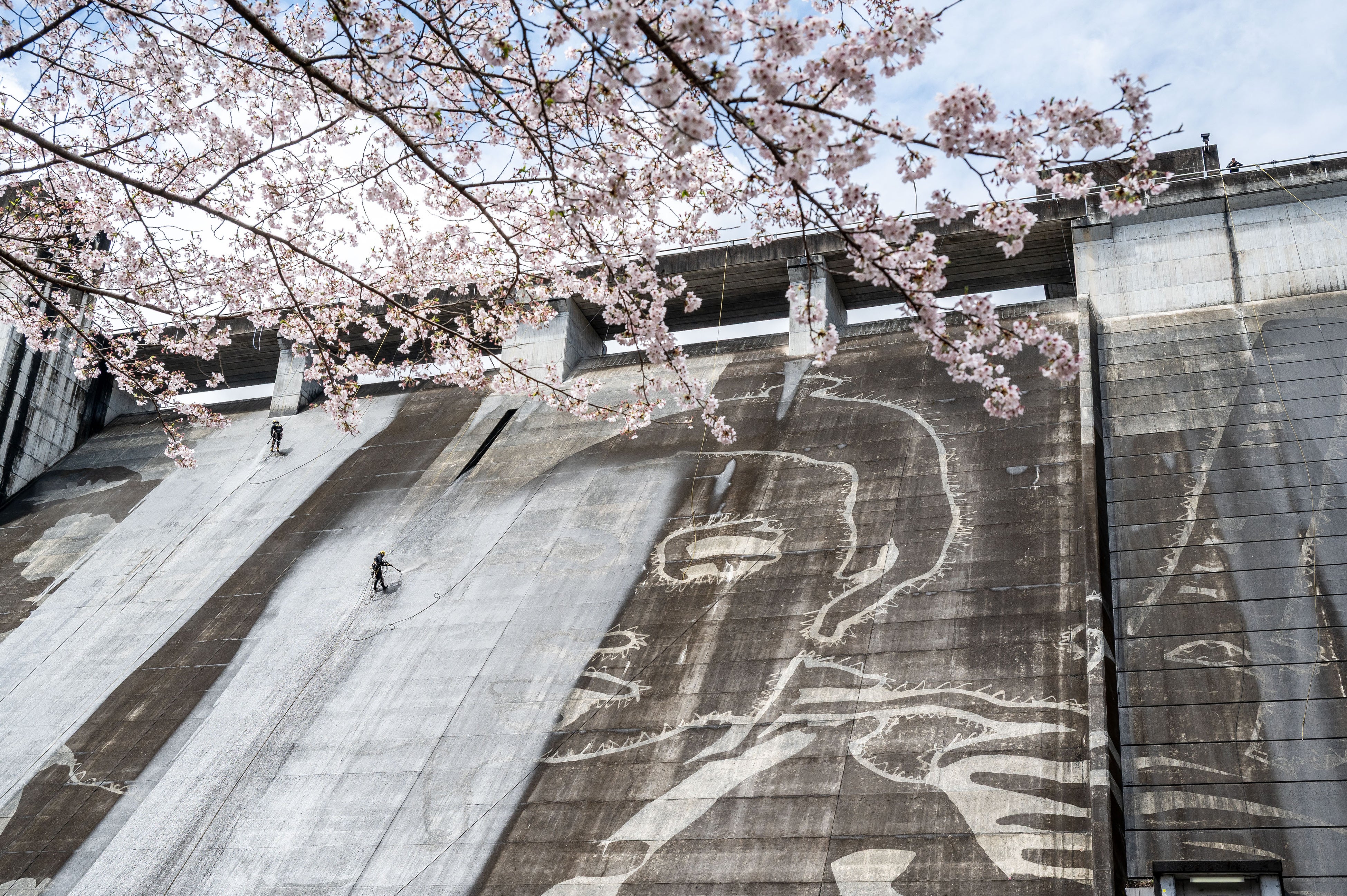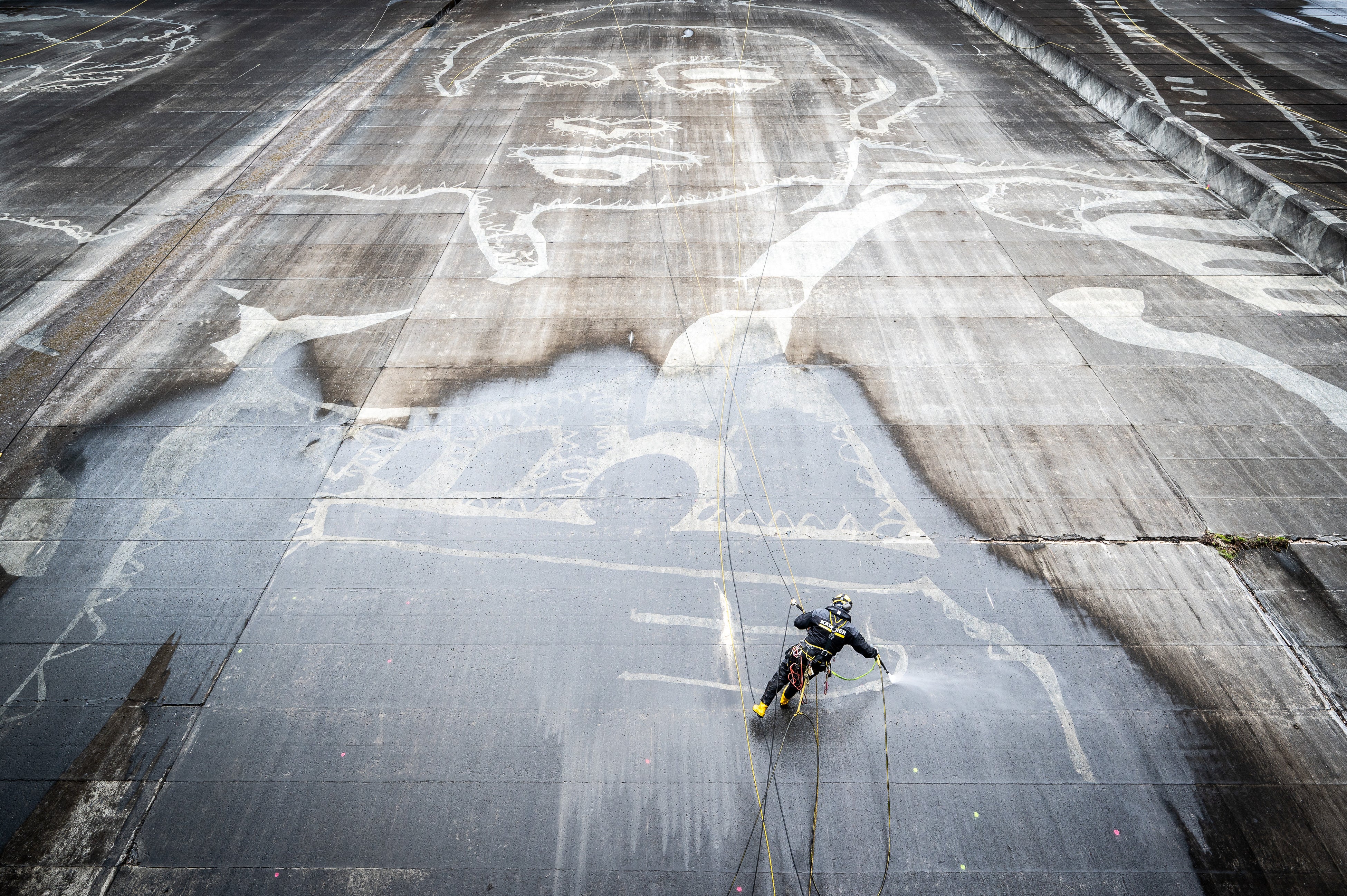 次に、測量結果をもとにマーキングされたポイントに沿って、モチーフの輪郭を縁取り。巨大な壁面を目の前にすると、絵の全体像が分かりづらいため、手元の図面と照らし合わせながら、慎重かつ正確に高圧洗浄機のノズルで輪郭を描き、ダムアートの下絵が完成。