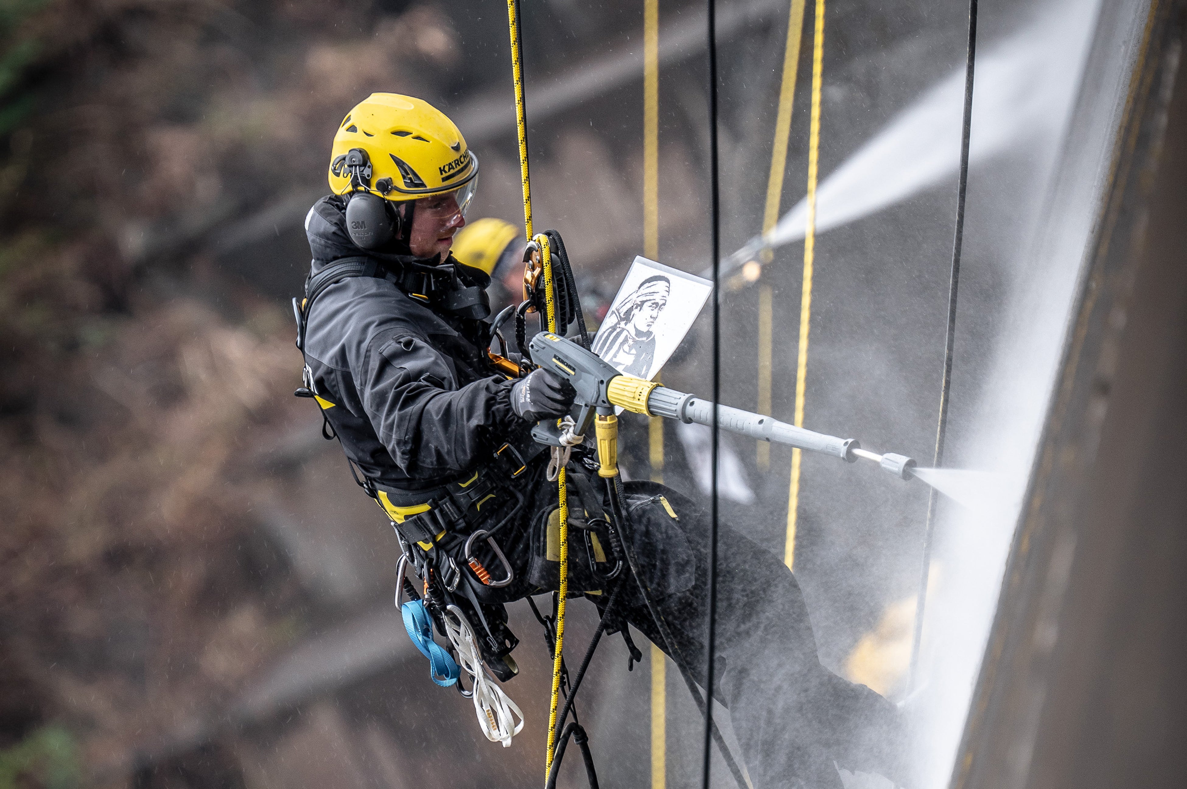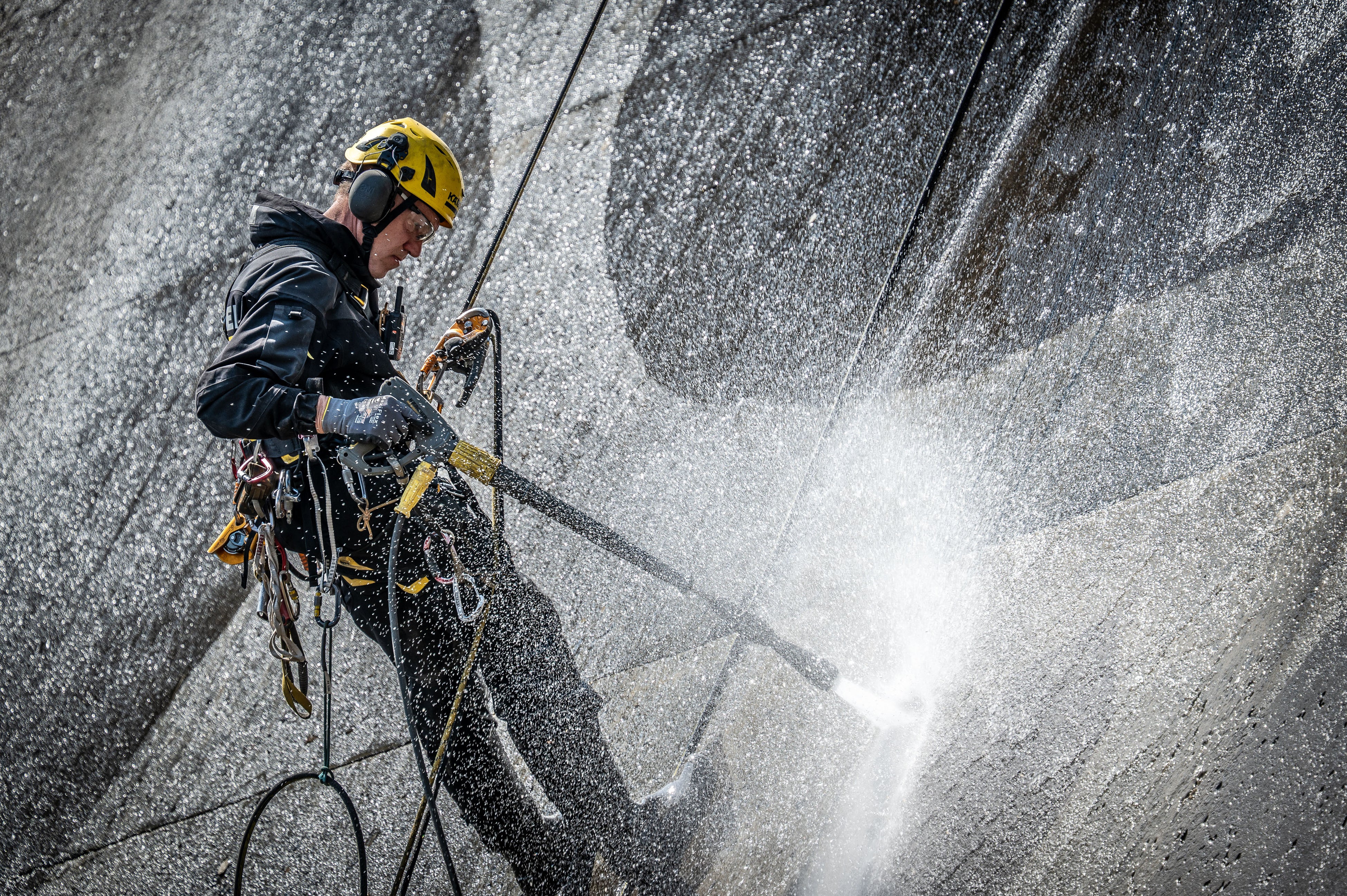 完成した縁取りに沿って、洗浄チームが高圧洗浄機でダムの壁面を洗浄します。汚れを除去した箇所とのコントラストによって、「侍」が描かれます。一度除去するともとには戻せず、失敗が許されないため、細心の注意を払い、ディテールが正確に表現されるように、長年の実績と経験をもとに洗浄作業を行います。