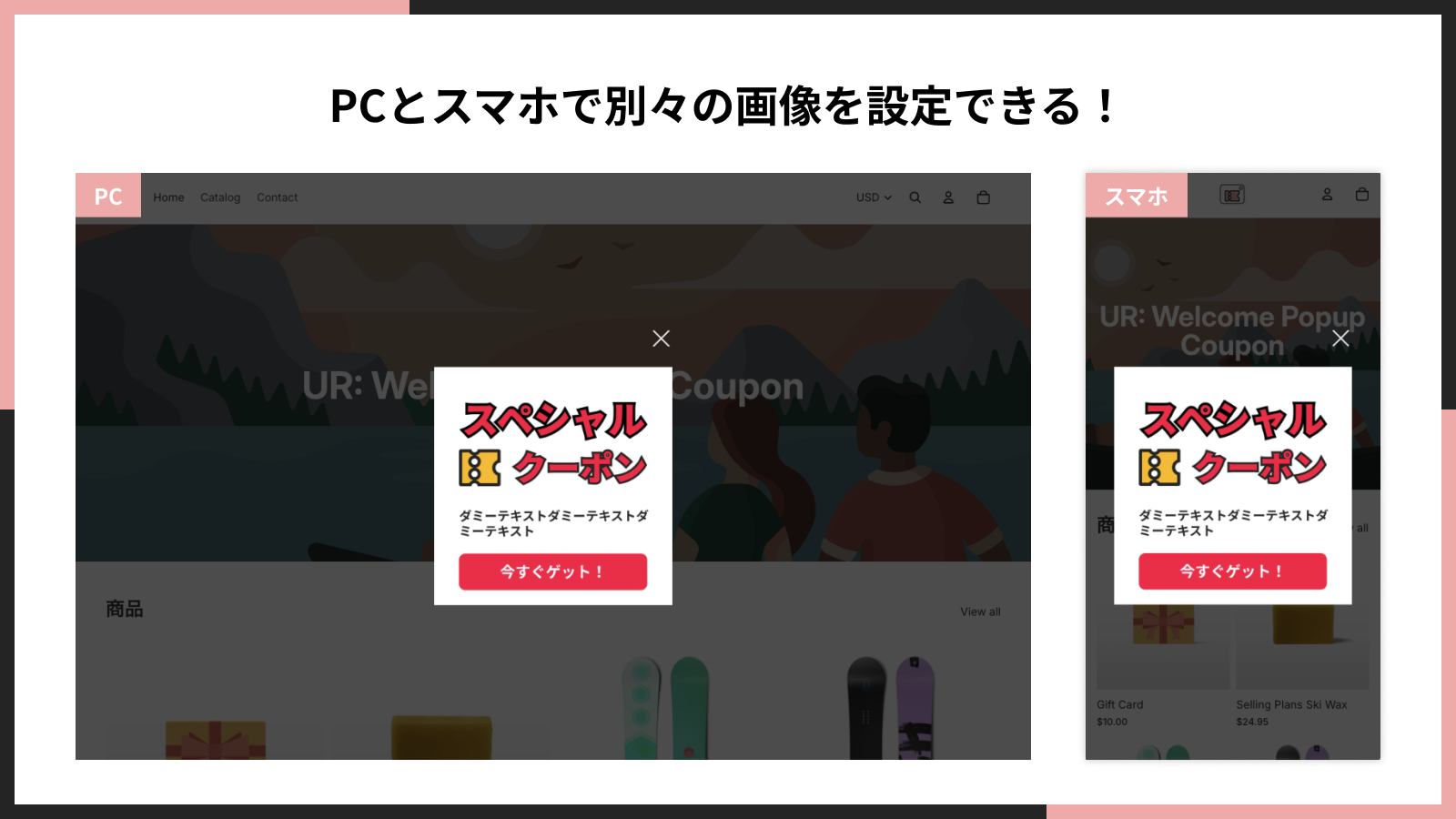 コーディング知識は一切不要で、管理画面から画像とクーポン内容を設定するだけで、ストア訪問者に向けたポップアップをすぐに公開できます。ストアのデザインやキャンペーンに合わせたビジュアル訴求が可能で、初回訪問時の印象を高めながら購入を効果的に後押しします。PC・スマートフォンの両方に対応しており、あらゆるデバイスで最適な表示を実現します。