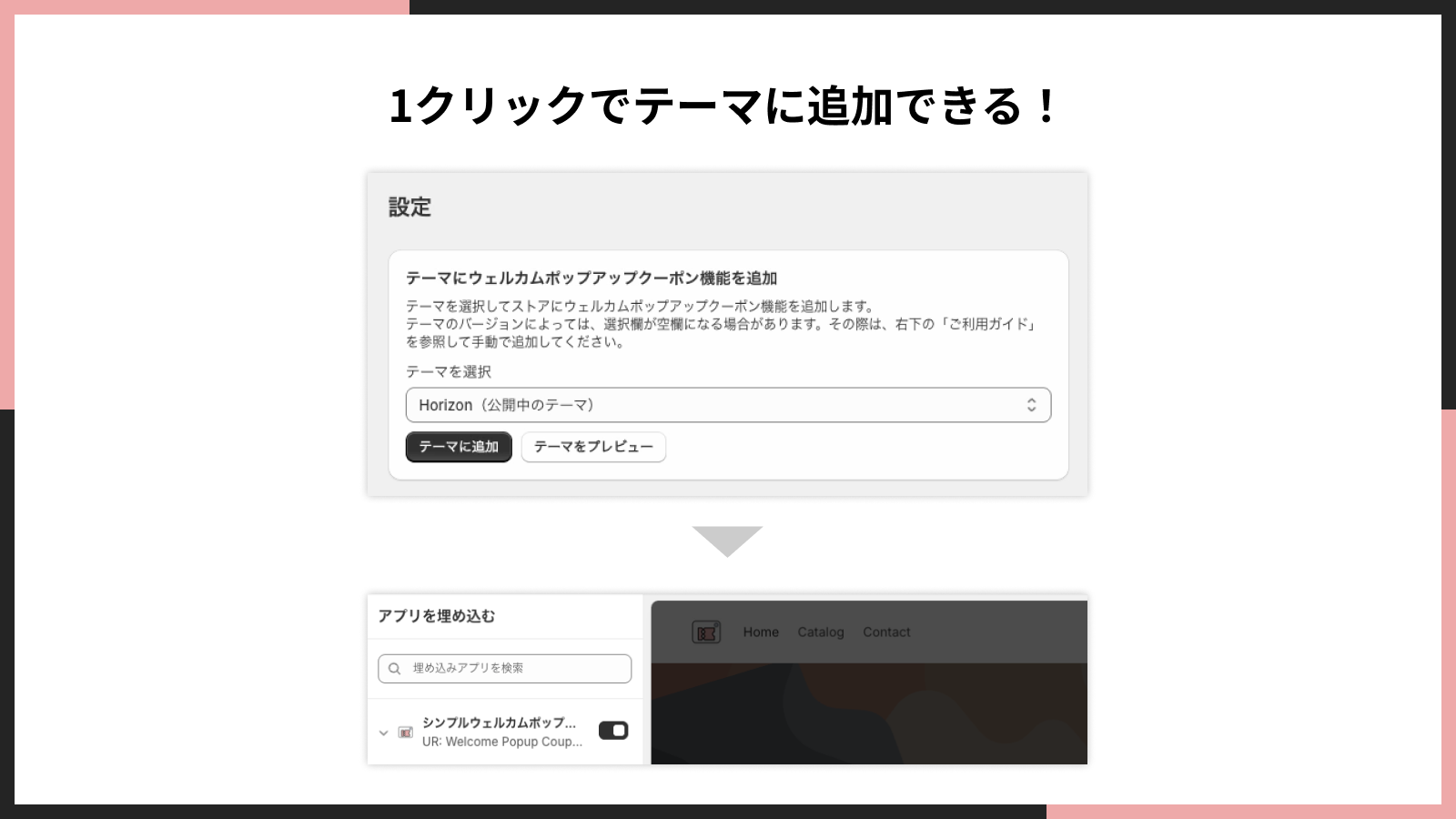 アプリをインストール後、複雑な設定やコード編集は不要。管理画面からワンクリックでテーマに追加でき、ウェルカムポップアップクーポンをすぐに表示できます。初めてShopifyアプリを導入する方でも迷わず使える設計で、導入までの手間を最小限に抑えながら、スピーディーにキャンペーンや初回購入施策を実施できます。