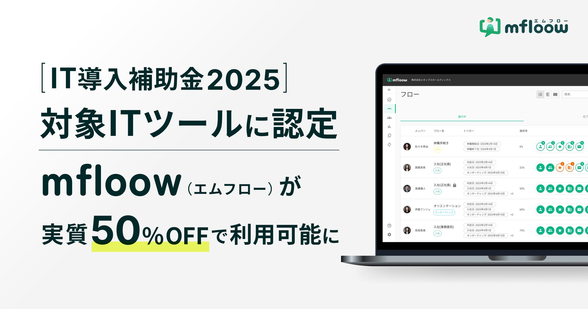株式会社メタップスホールディングス(渋谷区、代表取締役社長 山﨑 祐一郎)が提供する従業員ライフサイクル管理ツール「mfloow(エムフロー)」が「IT導入補助金2025」の補助対象ITツールとして正式に認定されました。これにより「mfloow(エムフロー)」を新規導入する対象事業者は導入費用の1/2の補助金を活用することが可能となります。