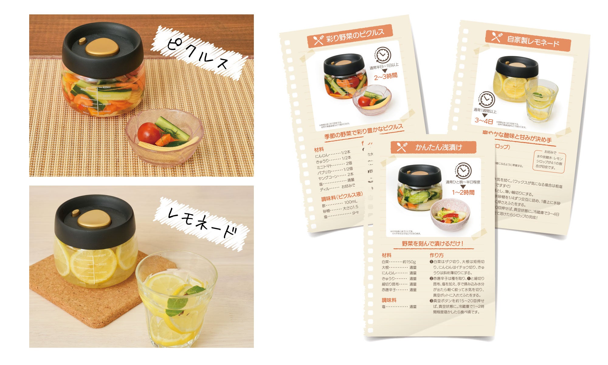 真空にすることでボトル内の食材に圧力がかかり、下味付けの調理時間が短縮され、短時間で食材が味わい深くなります。