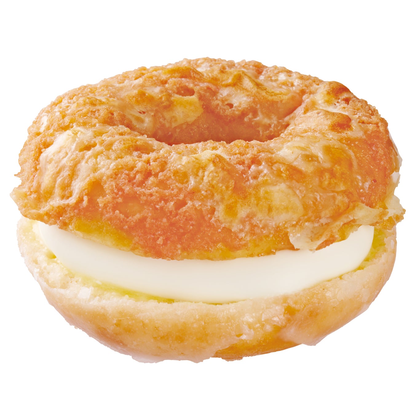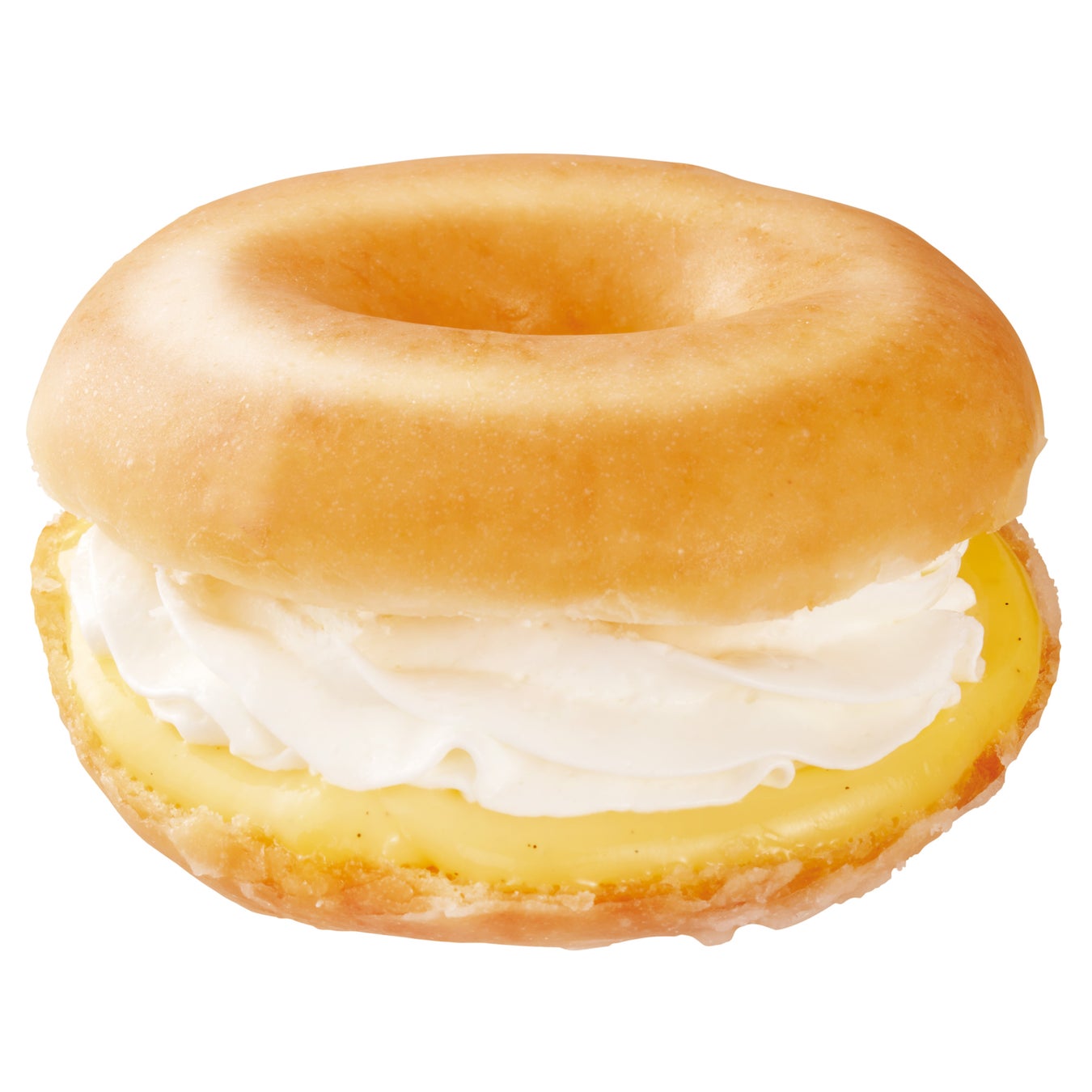 『オリグレ ホイップ&カスタード』はKKDJの不動の人気No.1「オリジナル・グレーズド®(=オリグレ)」をベースにした最もシンプルな同シリーズの看板商品です。オリグレを半分にカットし、人気No.2の「ブリュレ グレーズド」にも使用しているカスタードクリームとあっさりとしたホイップクリームを重ねた、KKDJらしいシンプルな美味しさを楽しむことができます。