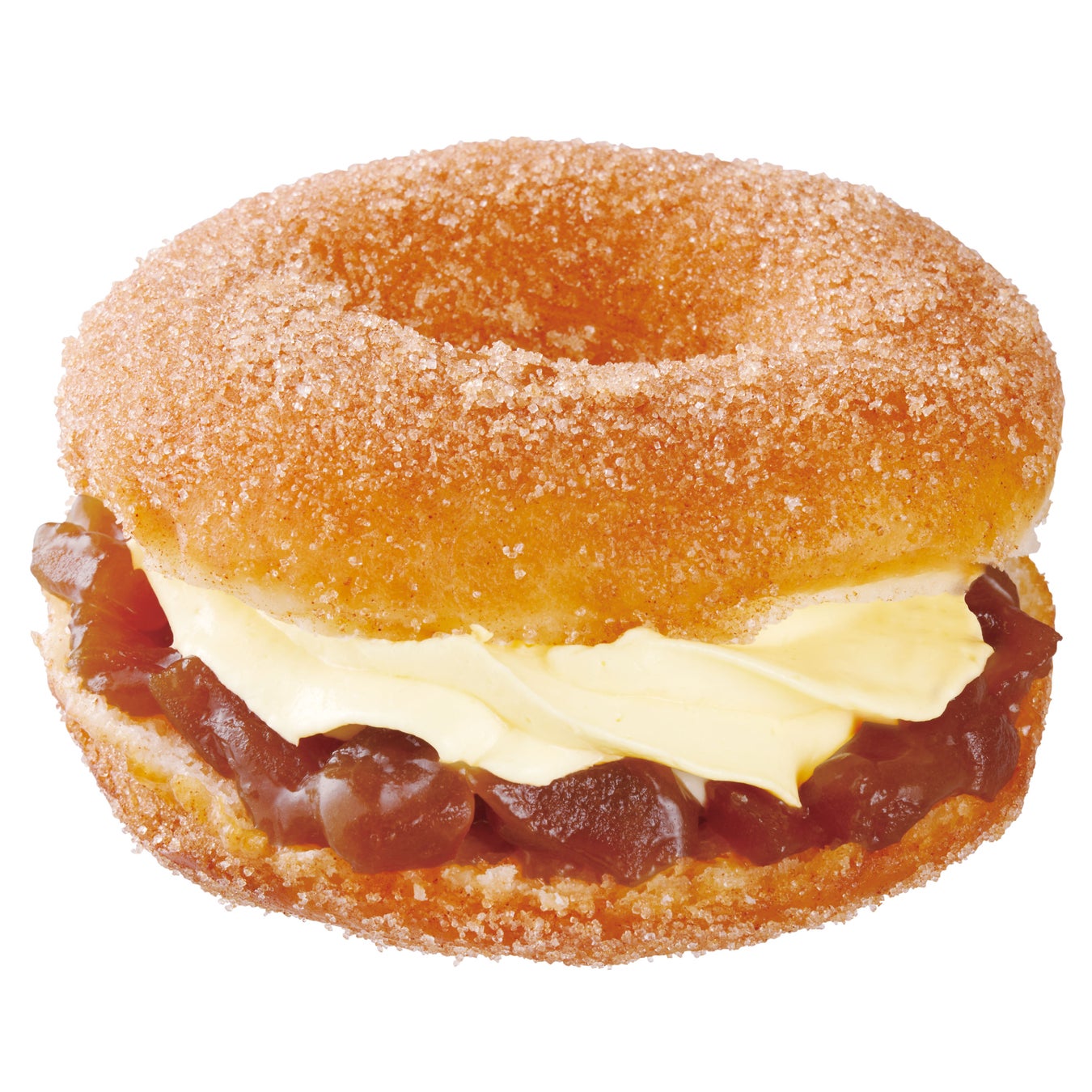 『シナモン アップル&カスタード』は期間限定のフレーバーで「シナモンシュガー」をベースに、角切りアップルとカスタードホイップをサンドしました。ふわっと香るスパイシーなシナモンの風味とアップルとカスタードが口の中で溶け合い、アップルパイのような上品な美味しさを味わうことができます。
