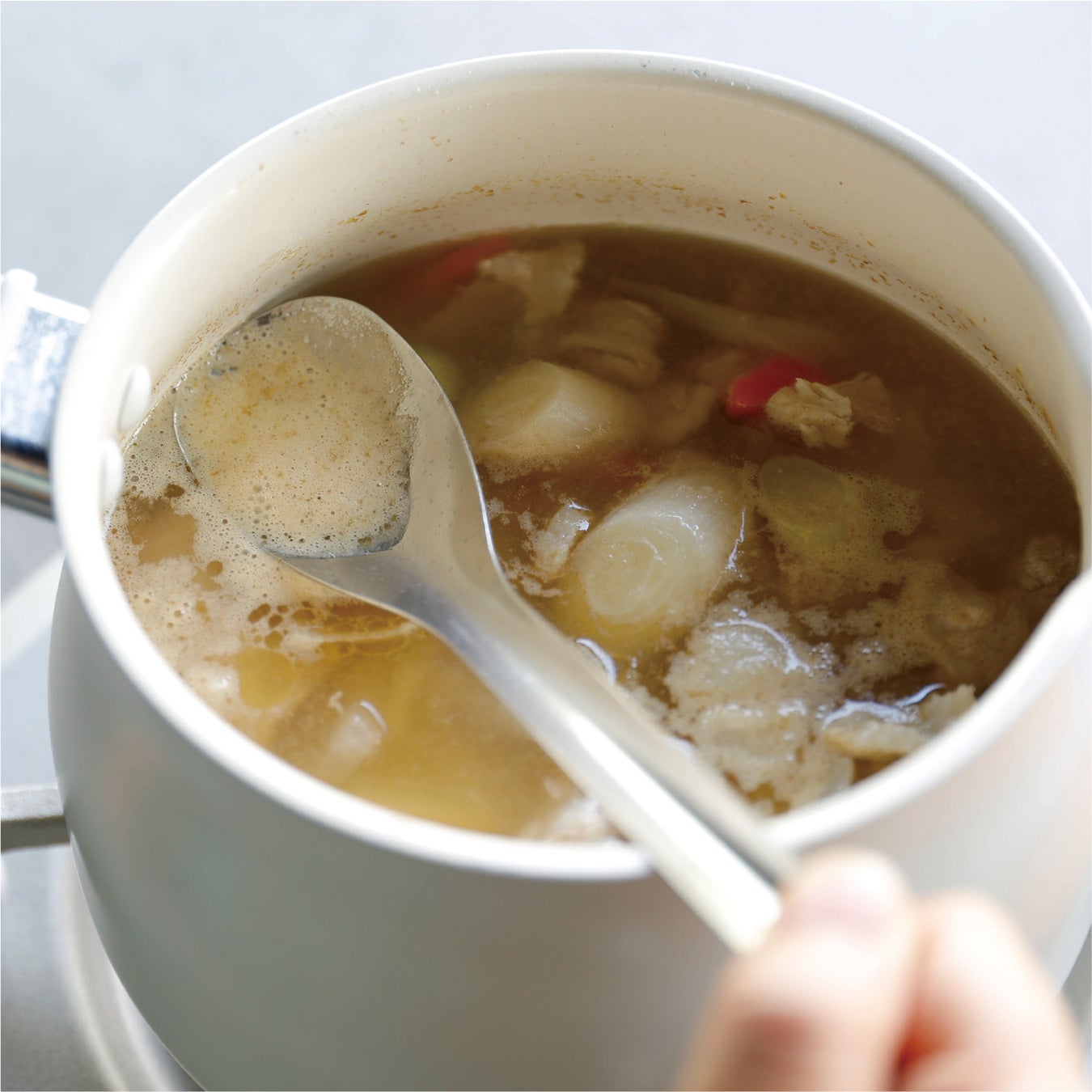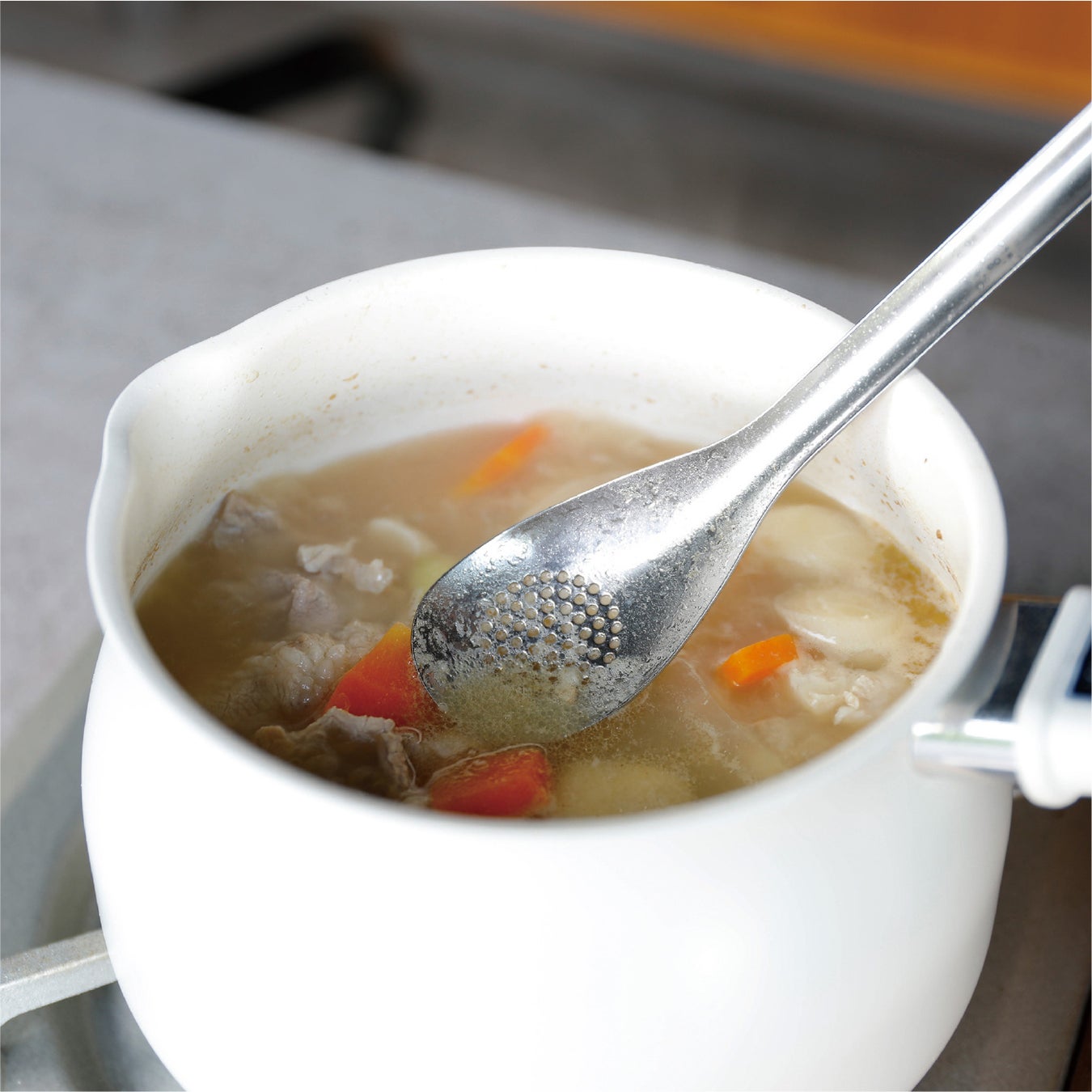 鍋の側面にスプーンを当てながらあく取りがしやすいように、スプーンの形状が丸く設計されています。またスプーンに穴が空いているので、余分な汁気を切りたいときには