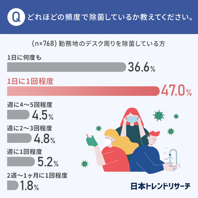 | 1日に1回程度 | 咳やくしゃみが机の上にかかっていると考えられるため、気が付いたときに消毒するようにしている。(50代・男性) |