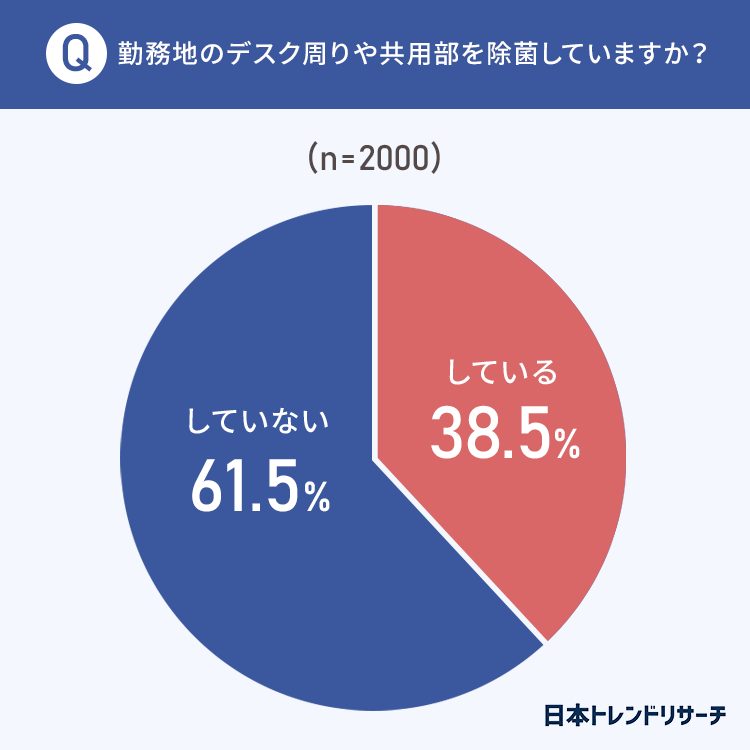 【衛生意識】勤務地のデスク回りや共用部の除菌は38.5%に留まる