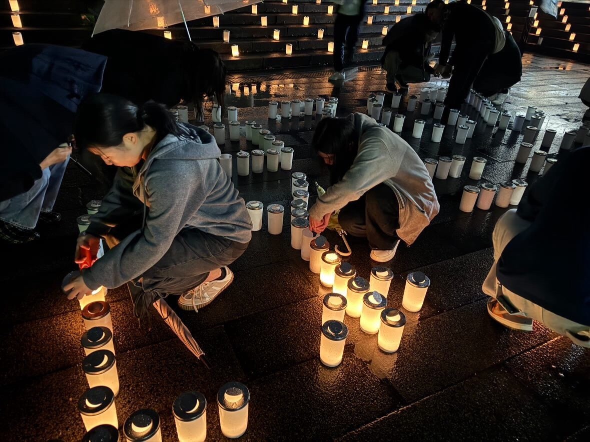 当日は、大学コミュニティプラザに1,700個を超えるキャンドルを並べ、平岡さんのご冥福を祈りました。また、昨年に引き続き事件に関するパネル展示を行い、発生から16年が経過した今も事件を忘れず、防犯への意識を高める場としました。今年は新たな取り組みとして、地域の方々が制作したペットボトルキャンドルを使用し、平和の象徴であるクローバーの灯りを形作りました。雨天にもかかわらず多くの方々にご参加いただき、事件や防犯について改めて考える貴重な時間となりました。