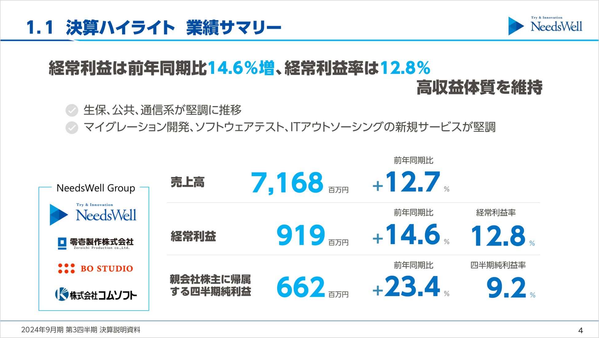 経常利益は前年同期比14.6%増、経常利益率は12.8% 高収益体質を維持